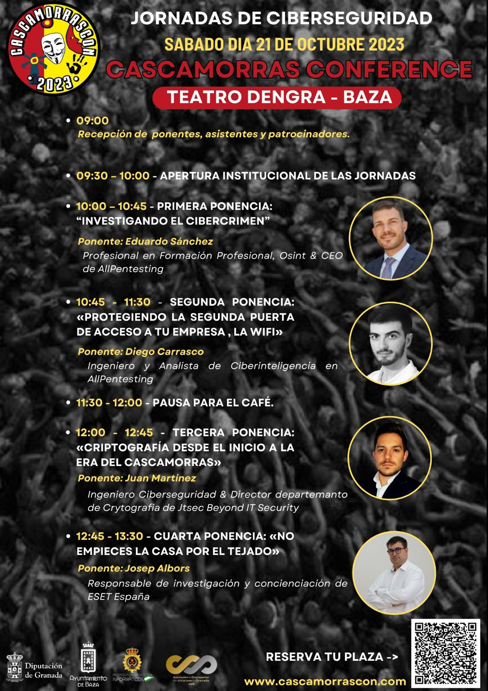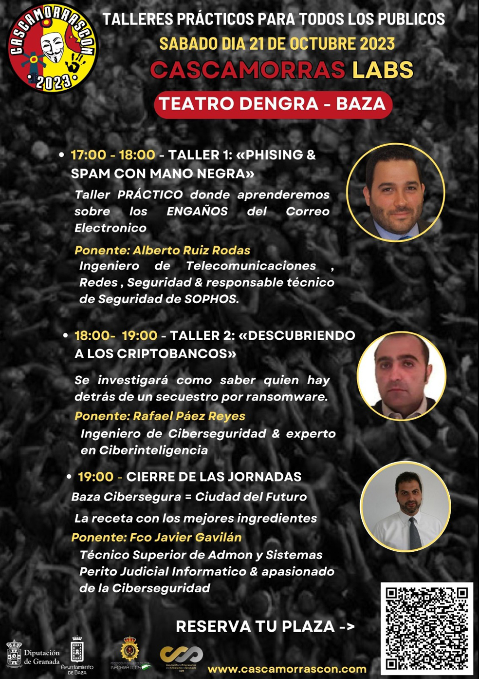 Ya está todo preparado y dispuesto para que nuestra presencia en las redes sociales y nuestras gestiones digitales, tanto a nivel de empresa como en familia, sean seguras. Un importante grupo de expertos, con experiencia y con conocimientos suficientes, va a venir a Baza los días 20 y 21 de octubre a enseñarnos cómo podemos conseguir esa tranquilidad que tanto nos interesa. Son las I Jornadas de Seguridad Informática (Ciberseguridad) que se están difundiendo bajo el título genérico de “Cascamorrascon”. Habrá conferencias con evidencias teóricas y prácticas, charlas distendidas y ejemplos de circunstancias habituales, talleres explicativos, didácticos, debates, se podrá consultar y, sobre todo, se aprenderá mucho sobre la seguridad en la red. Están dirigidas a empresas y a familias en general, incluso se han repartido los contenidos en espacios diferentes, aunque cualquier persona podrá acceder a la sesión que quiera. Además, toda la programación es totalmente gratuita. Si es posible, les recomendamos inscribirse en la web cascamorrascon.com. Las I Jornadas de Ciberseguridad están organizadas por la Asociación de Empresarios del Altiplano de Granada, y cuentan con la colaboración del Ayuntamiento de Baza, de la Diputación, y de las fuerzas de seguridad. Tras ellas está también la Asociación Andaluza de Delitos Informáticos, cuyo máximo responsable es el bastetano Francisco Javier Gavilán.