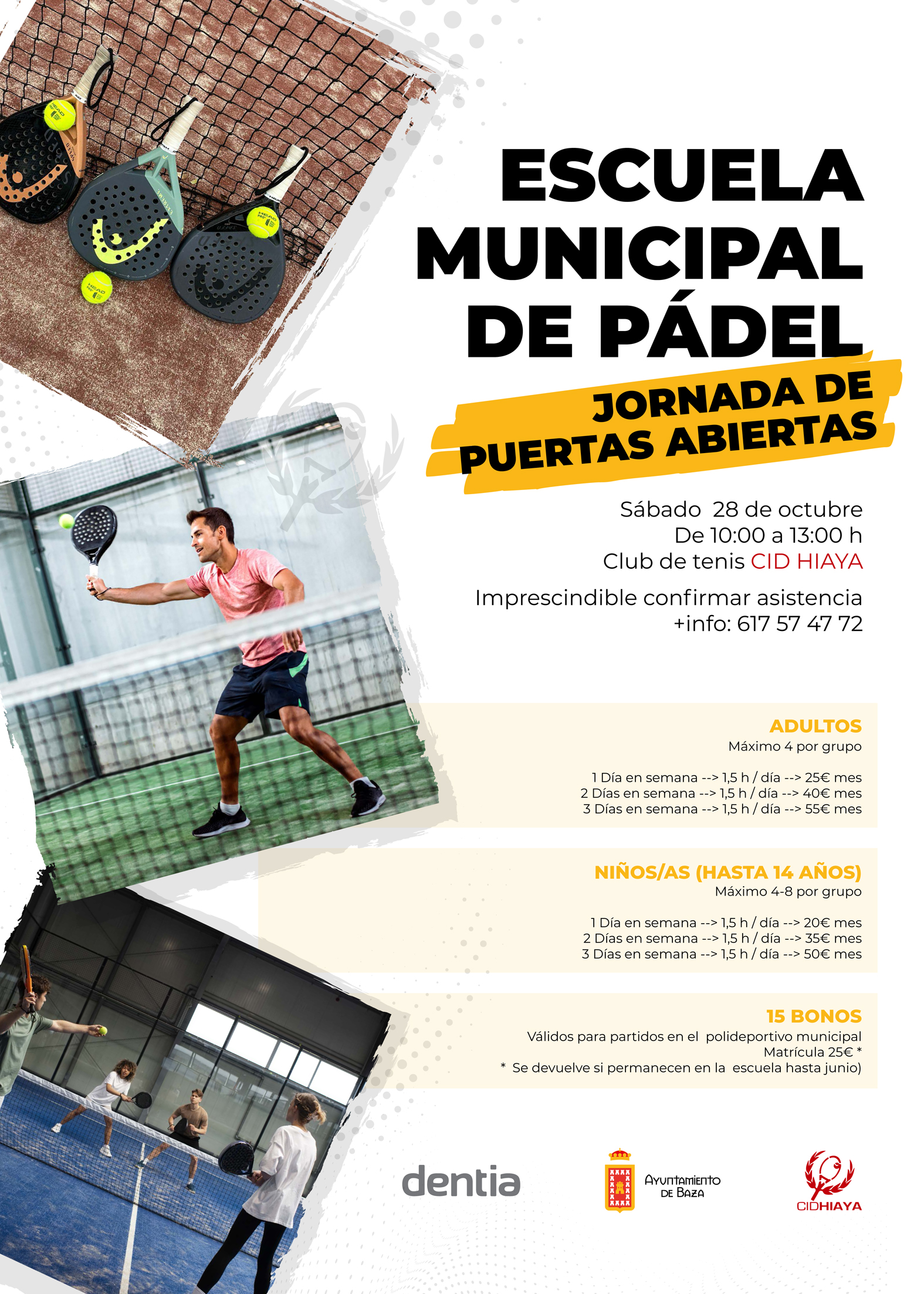 Ya está todo preparado para que eche a andar la Escuela Municipal de Pádel que ha preparado el Ayuntamiento de Baza. El plazo de inscripción está abierto y el inicio de las sesiones se ha previsto para el jueves 2 de noviembre. Los interesados pueden dirigirse para formalizar su plaza al Club de Tenis “Cid Hiaya”, al pabellón municipal de deportes o al número de teléfono 617 574 772. De hecho, este sábado, 28 de octubre, se celebrará una jornada de puertas abiertas en el Club de Tenis “Cid Hiaya” de 10:00 a 13:00 horas para aclarar dudas, para informarse y para conocer las instalaciones donde se desarrollará esta Escuela Municipal de Pádel. Para asistir a ella hay que confirmar en el número arriba indicado.