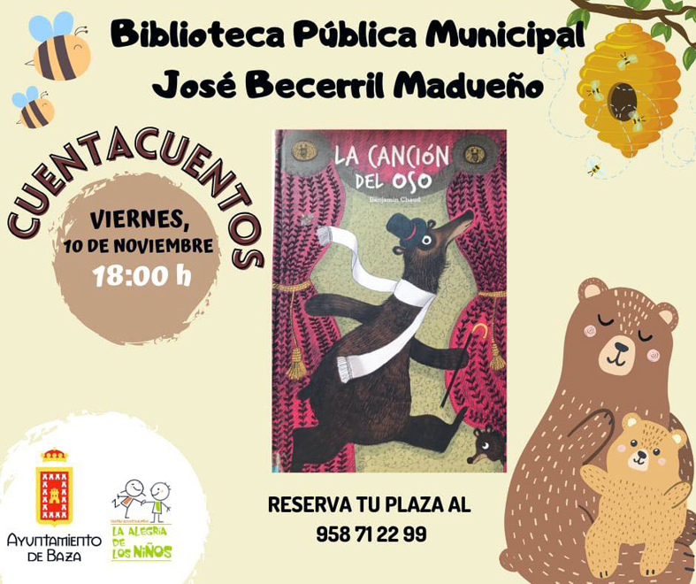 Al mismo tiempo, aprovechamos para comunicarte que también está abierto el plazo para inscribirse en el cuentacuentos del viernes 10 de noviembre, como siempre a partir de las seis de la tarde. En este caso abriremos “La canción del oso”, un precioso álbum ilustrado del autor Benjamin Chaud que hará las delicias de los más pequeños. Ya sabes, reserva tu plaza en el 958 712 299.