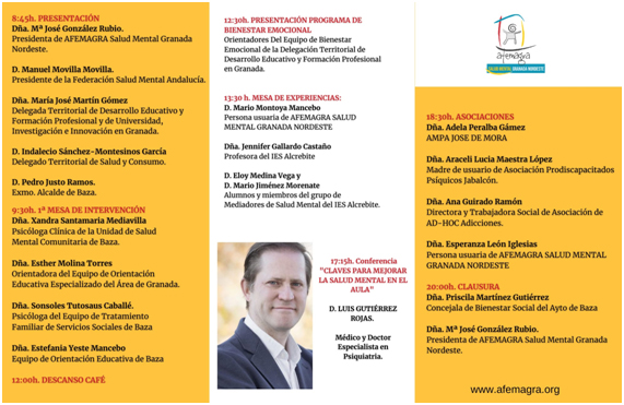 Uno de los ingredientes más destacados de la programación que trae este año la Plaza de la Salud es la VII Jornada: Educación y Salud Mental, organizada por la asociación Afemagra Salud Mental Granada Nordeste. Según la trabajadora social de esta entidad, Mª José Muñoz, pretende ser un espacio de encuentro y de trabajo para dar a conocer conocimientos y habilidades para comprender y atender mejor a las personas que presentan problemas de salud mental. De hecho, se ha realizado una llamada especial a la presencia de docentes y se ha contado con la colaboración en la preparación del Centro de Profesores y del Equipo de Orientación Educativa de Baza. La jornada comenzará a las 8:45 en el salón Ideal; se espera una primera mesa de intervenciones sobre el asunto, la presentación del Programa de Bienestar Emocional, una mesa con experiencias, la intervención de distintas asociaciones y la conferencia del Doctor Especialista en Psiquiatría, Luis Gutiérrez Rojas, “Claves para mejorar la salud mental en el aula”.
