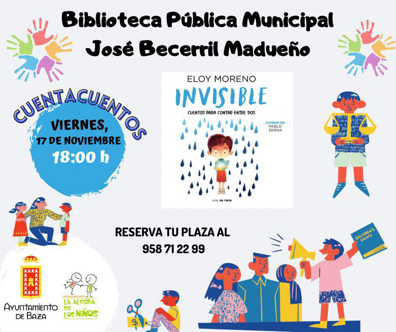 Nueva edición del cuentacuentos de la Biblioteca Municipal. Este viernes, 17 de noviembre, a partir de las 18:00 horas, te ofrecemos “Invisible”, álbum ilustrado de Eloy Moreno, una adaptación de su novela juvenil del mismo título. Estamos hablando de un best seller que ha sido lectura obligatoria en decenas de institutos de todo el país. Una historia que ha emocionado a miles de lectores sobre el bulling visto desde la propia víctima. En este caso, en una adaptación muy divertida para compartir entre padres e hijos. Como siempre, es imprescindible reservar la plaza en el teléfono 959 712 299.