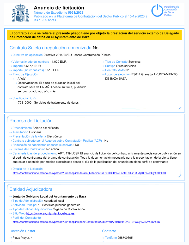 Ya se encuentra publicado el anuncio de licitación que va a regir la contratación de un servicio externo de Delegación de Protección de Datos en el Ayuntamiento de Baza, que se realizará por procedimiento abierto simplificado. El presupuesto base de licitación es de 6.667,10 euros (iva incluido) y se podrán presentar ofertas hasta el día 30 de diciembre de 2023.