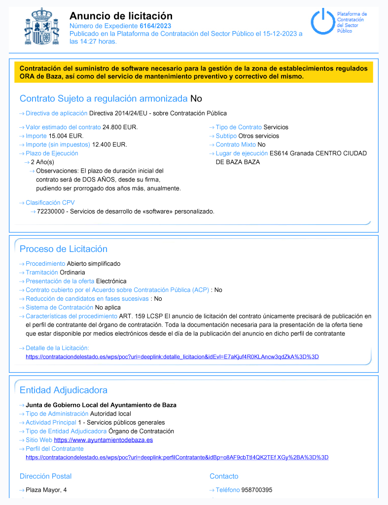 El Ayuntamiento de Baza ya ha publicado el anuncio de licitación que va a regular la contratación del suministro del software necesario para la gestión de la zona de estacionamientos ORA de Baza, en el que se añade también el servicio de mantenimiento preventivo y correctivo del mismo, ambos por procedimiento abierto simplificado. El presupuesto base de licitación es de 15.004 euros (iva incluido) y las ofertas podrán presentarse hasta el día 30 de diciembre de 2023.