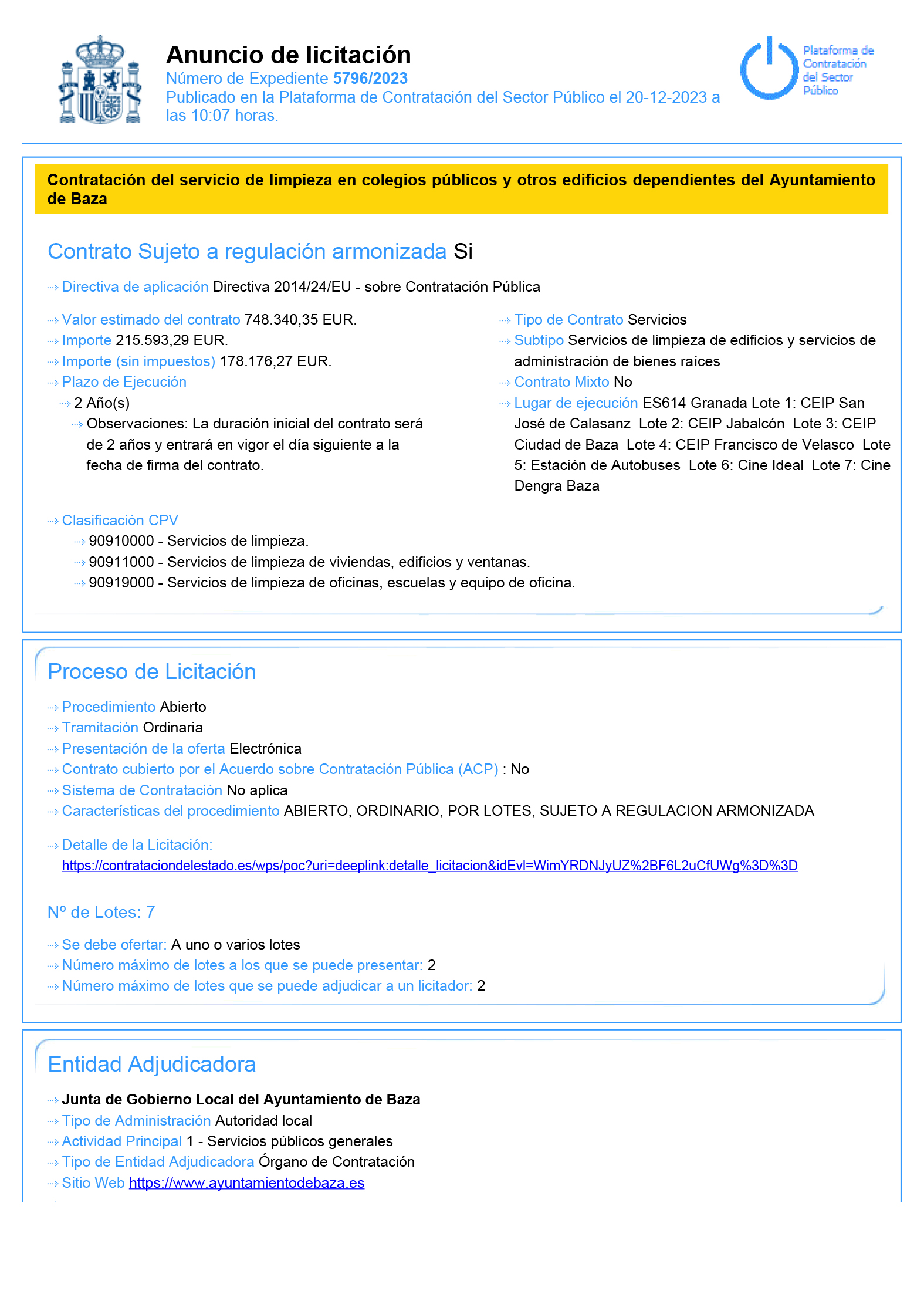 Ya está publicado y a disposición de los interesados en la plataforma de contratación del sector público, el anuncio de licitación que va a regir la contratación del servicio de limpieza en colegios públicos dependientes del Ayuntamiento de Baza, así como en otros edificios de titularidad municipal como la estación de autobuses, el salón Ideal y el teatro Dengra. El procedimiento que se empleará será abierto, sujeto a regulación armonizada. El contrato se divide en siete lotes y cada uno tiene su presupuesto respectivo: