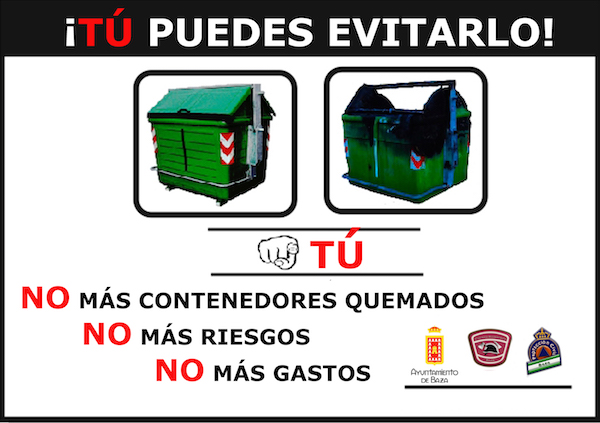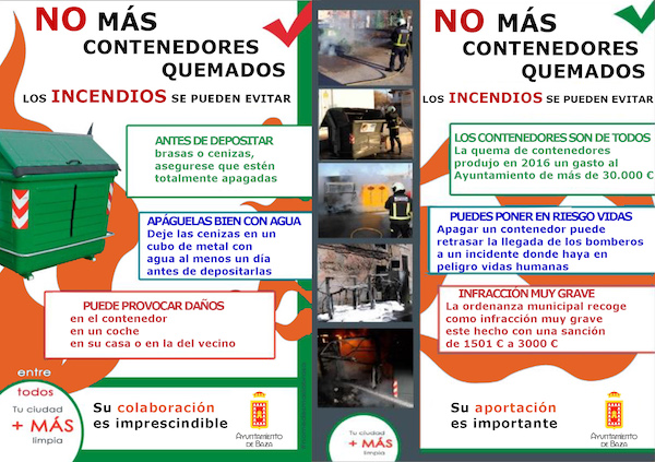 La reiterada aparición de estos incidentes obliga al cuerpo de bomberos a reactivar con frecuencia la campaña de concienciación que ya todos deberían conocer contra los incendios en contenedores, especialmente los que se producen, como en estos casos, de manera fortuita por imprudencias. Se ha editado de nuevo una octavilla informativa que se ha repartido por algunas dependencias municipales en la que se recuerda que este tipo de incendios “se pueden evitar”. Para ello se insiste en que “antes de depositar brasas o cenizas, asegúrese que están totalmente apagadas”. “Apáguelas bien con agua; deje las cenizas en un cubo de metal con agua al menos un día antes de depositarlas en el contenedor”. Se recuerda que “puede provocar daños en el contenedor, en un coche, en su propia casa o en la de un vecino”. Así mismo, se insiste en que “los contenedores son de todos” y que “la quema de contenedores produce gastos de varios miles de euros cada año”. Por último, el documento gráfico nos alerta de que con este tipo de actos imprudentes “puedes poner en riesgo vidas; apagar un contenedor puede retrasar la llegada de los bomberos a un incidente donde haya en peligro vidas humanas”. Para los que no atiendan estas recomendaciones se les informa que cometer este tipo de acto supone una infracción muy grave, “la ordenanza municipal recoge como infracción muy grave la quema de contenedores, con una sanción que puede ir desde los 1.501 a los 3.000 euros”.