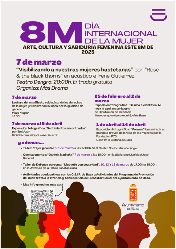 Baza celebra un año más el 8M, Día Internacional de la Mujer. Para ello, la concejalía de Igualdad y Bienestar Social ha preparado una programación especial de actividades que comenzará este viernes, 7 de marzo. A las 12:00h., en la Plaza Mayor, está prevista la lectura del manifiesto reivindicativo aprobado por unanimidad por la corporación municipal, en el que se defienden los derechos de la mujer y se da visibilidad a la lucha por la igualdad de género. Ese mismo día, 7 de marzo, a partir de las 20:00h., el teatro Dengra acoge el acto central de esta celebración. Se trata de un gran espectáculo titulado “Visibilizando a nuestras mujeres bastetanas”, en reconocimiento a todas esas vecinas que han contribuido desde sus barrios, con pasos fundamentales, a la construcción de una sociedad más justa e igualitaria. Además de diferentes intervenciones y algunas sorpresas, contaremos con la intervención del grupo “Rose & the black thorns” en acústico junto a Irene Gutiérrez. La entrada al acto, que está organizado por “MasDrama”, es totalmente gratuita hasta completar aforo.