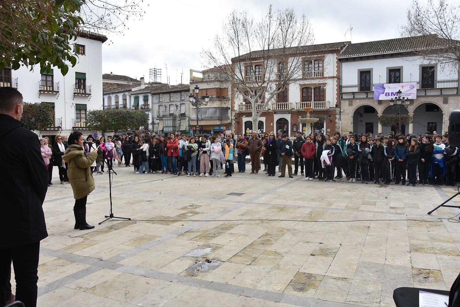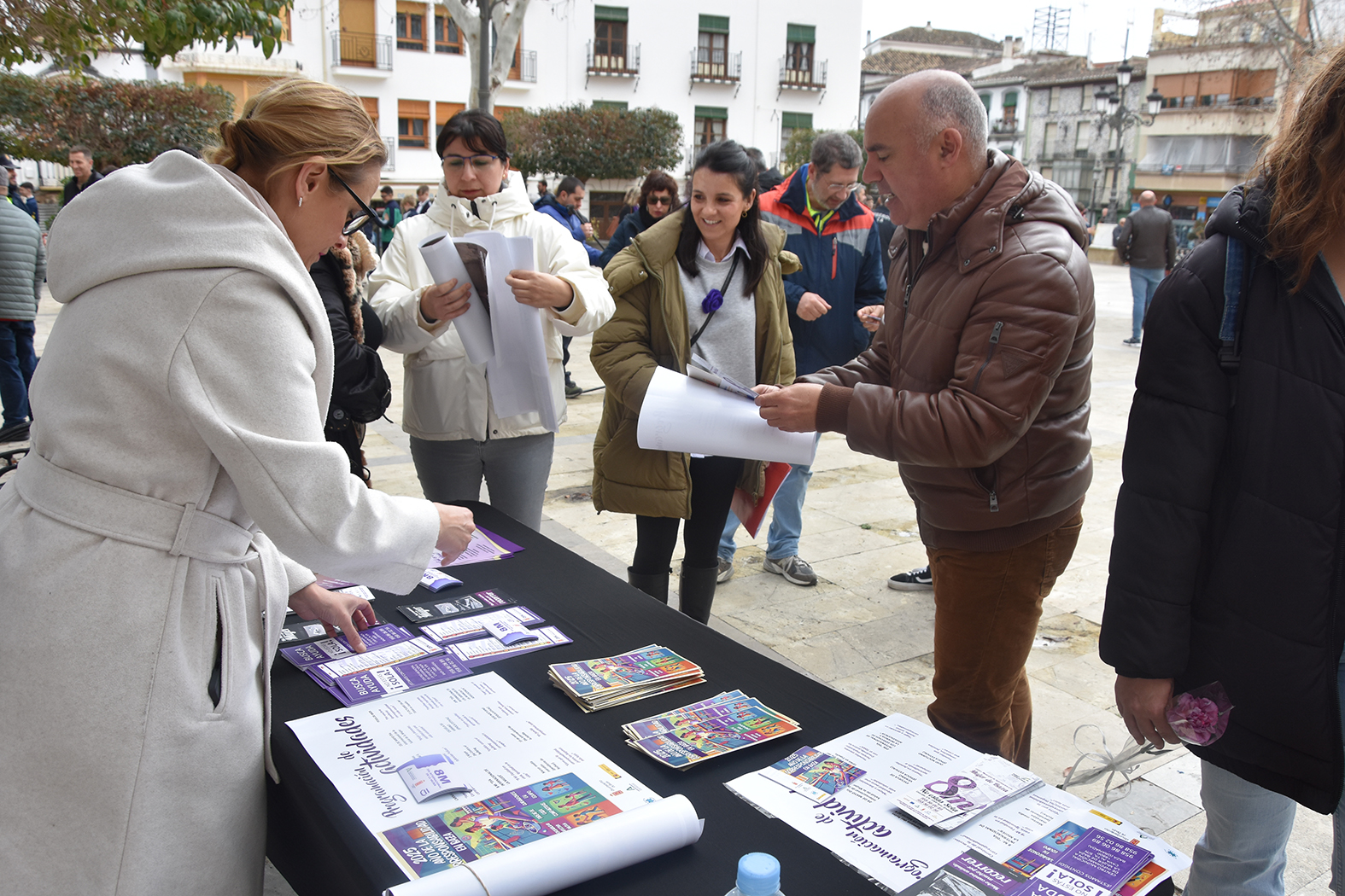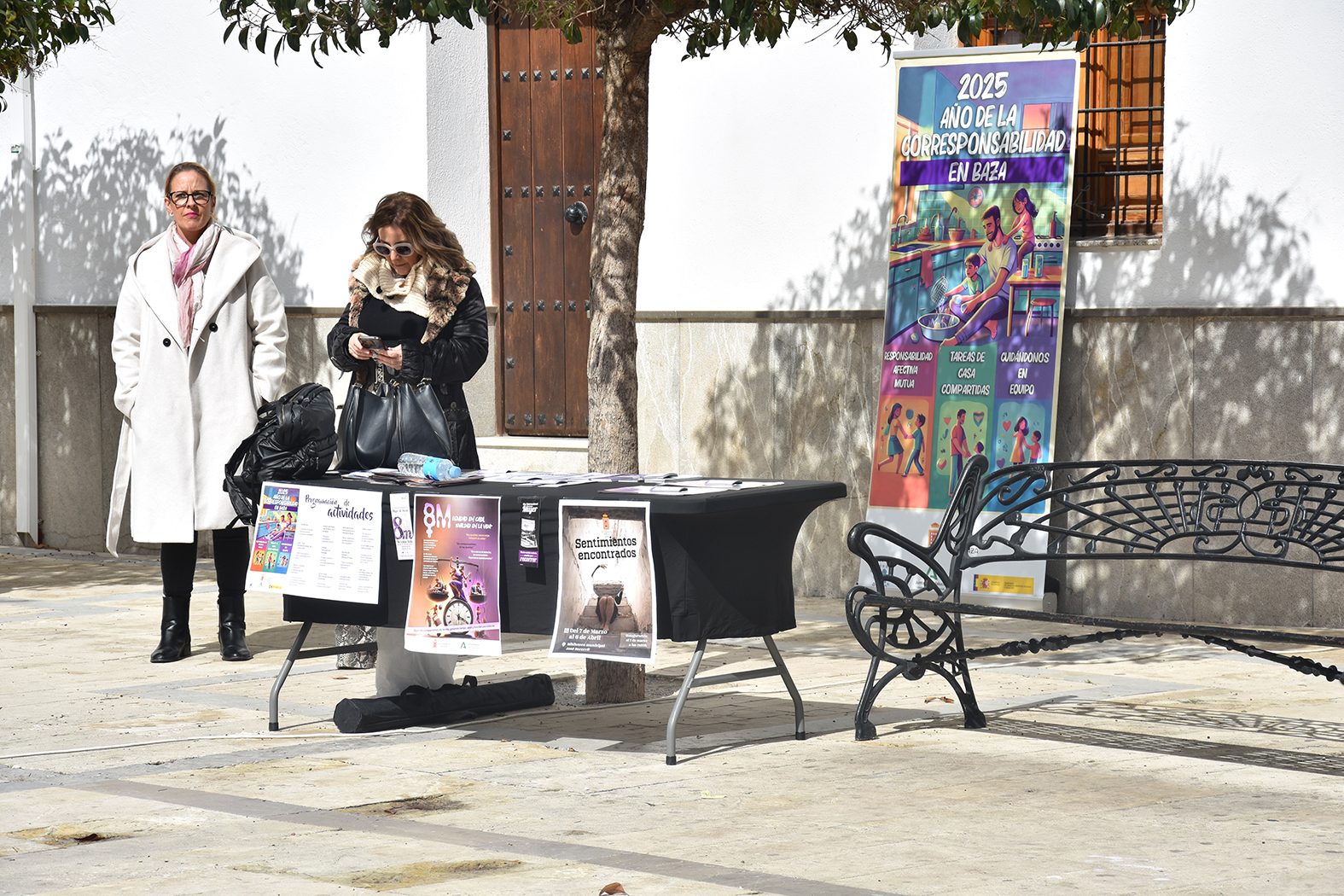 Aquella misma mañana del viernes 7 de marzo, en la Plaza Mayor, un grupo de jóvenes estudiantes y de vecinos en general, acompañaron a los miembros de la corporación municipal y a los representantes de las fuerzas de seguridad en la lectura del Manifiesto Institucional aprobado por el Ayuntamiento de Baza con motivo del Día Internacional de la Mujer de este año, un texto que, como resaltó el alcalde, fue aprobado por unanimidad de todos los grupos municipales, algo que ya ocurrió el año pasado y que supone una agradable y satisfactoria novedad en nuestra ciudad. La encargada de dar lectura al texto fue la concejala de Igualdad, Priscila Martínez. Junto a ellos, un stand que nos recuerda que este 2025 es el año de la corresponsabilidad en Baza.