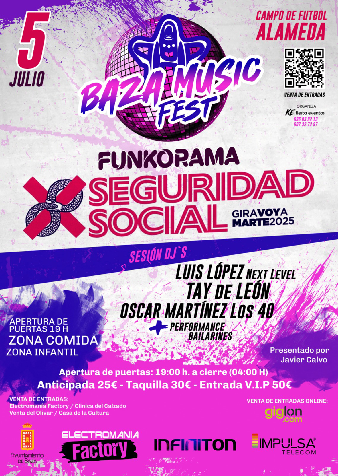 La gran apuesta que hace la empresa bastetana “KE fiesta eventos” en esta edición será la presencia del conocido grupo “Seguridad Social”, que trae lo mejor de su gira “Voy a Marte”, al que se suman las integrantes de “Funkorama” y un selecto grupo de Dj´s formado por Luis López, Tay de León y Óscar Martínez. Todo ello presentado por Javier Calvo. Una gran fiesta a la que se llama a todo tipo de público con ganas de pasarlo bien y que cuenta con el patrocinio de varias empresas de la ciudad.
