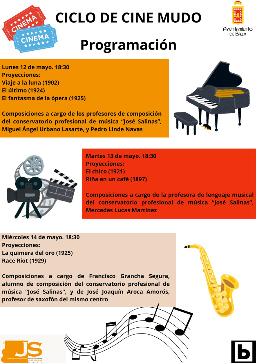 Dar a conocer los primeros años del cine, cuando el séptimo arte era mudo, promocionar algunas de las obras que se realizaron en aquellas tres primeras décadas de esta disciplina artística y, en definitiva, reunirse para hablar sobre este espectáculo tan popular, es lo que pretende el Ciclo de Cine Mudo que nos propone la Biblioteca Municipal de Baza en colaboración con el Conservatorio Profesional de Música “José Salinas” de nuestra ciudad. Se celebrará los días 12, 13 y 14 de mayo en el auditorio del Museo Arqueológico y la entrada, a las 18:30 horas, es gratuita y libre para todos los interesados. En todos los casos se ofrecerá una introducción de las proyecciones y de la música que las acompañará y tras disfrutar con ellas se abrirá un debate para analizar y opinar sobre las obras expuestas.