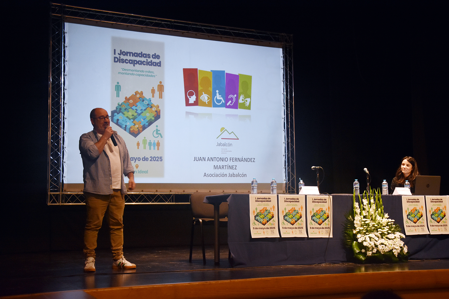 Tras el inicio de la proyección del vídeo “Mitos” se celebró la primera ponencia “Tipologías de discapacidades, una mirada integral”, a cargo de Juan Antonio Fernández, psicólogo de la asociación “Jabalcón”. A continuación, se celebró una mesa redonda “Recursos para personas con discapacidad”, en la que participarán Antonio Callejas, director de la ONCE en Baza; José Mª Mendoza, delegado provincial de Faisem en Granada; Nuria López, trabajadora social de “Jabalcón”; y Mª José Muñoz, trabajadora social de Afemagra. Tras el desayuno la jornada continuó con una nueva mesa redonda “Discapacidades: herramientas legales y medidas de apoyo”, con Néstor González, abogado, y Helga María Téllez, Notaria de Cúllar. Antes de la clausura se ofreció el vídeo “Capacidades”.