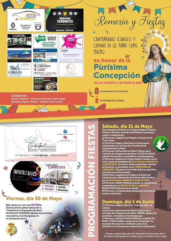El último fin de semana de mayo, que incluso se comparte con el primer día de junio, va a tener un carácter festivo en dos ubicaciones de nuestro término municipal. Los días 30 y 31 de mayo, viernes y sábado, y el domingo 1 de junio, el barrio del Baico y el Camino de la Torre Capel celebran sus tradicionales fiestas en honor a la Purísima Concepción, que en el caso de esta última zona se comparten con Cantarranas, perteneciente al término municipal de Caniles.