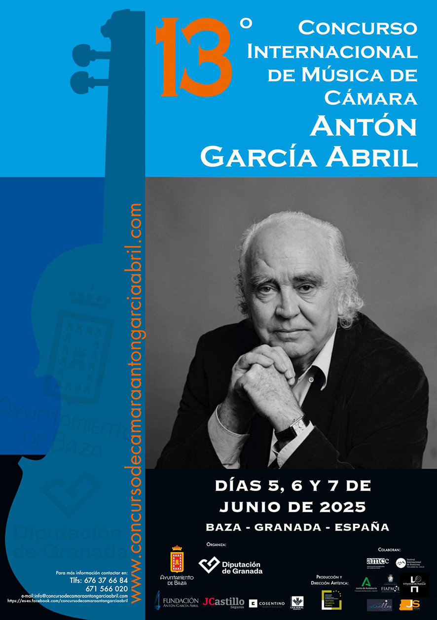 Del jueves 5 al sábado 7 de junio se celebra este año el Concurso Internacional de Música de Cámara “Antón García Abril”, que alcanza la decimotercera edición consolidado como un gran evento cultural que hace de Baza un foco mundial de excelencia musical y de apoyo al talento joven. Una convocatoria que se presenta con un récord de participación, ya que nunca antes han llegado tantas solicitudes para estar presentes en esta cita; muchos grupos no han obtenido plaza en el proceso de selección que ha realizado el jurado. Finalmente serán 30 grupos y 92 participantes de hasta once países, incluido el nuestro: Portugal, Países Bajos, Finlandia, Italia, Alemania, Estados Unidos, Polonia, Bélgica, Austria y Suiza. En los doce años anteriores del Concurso han pasado por aquí más de 800 jóvenes de más de 20 países de Europa, Asia y América.
