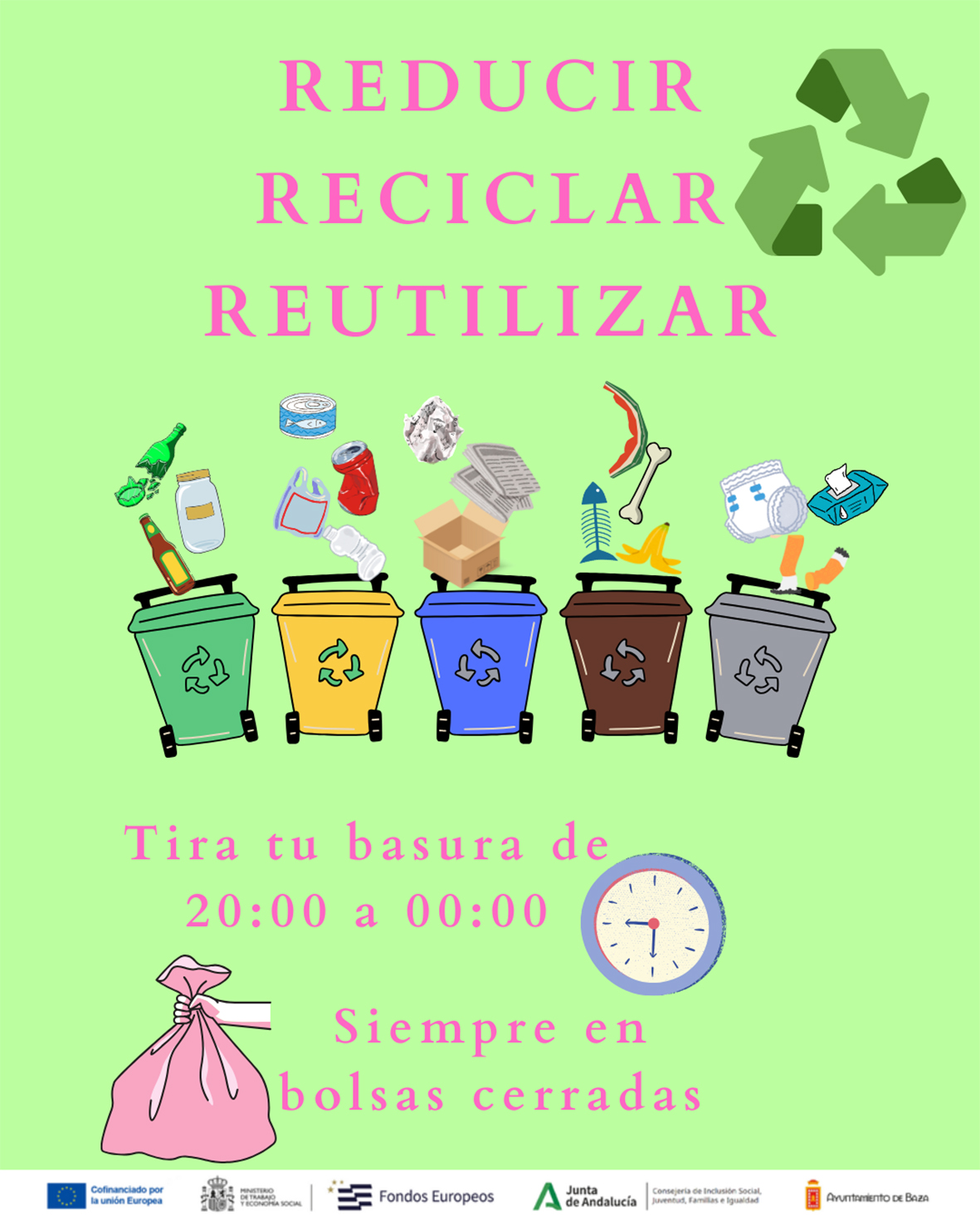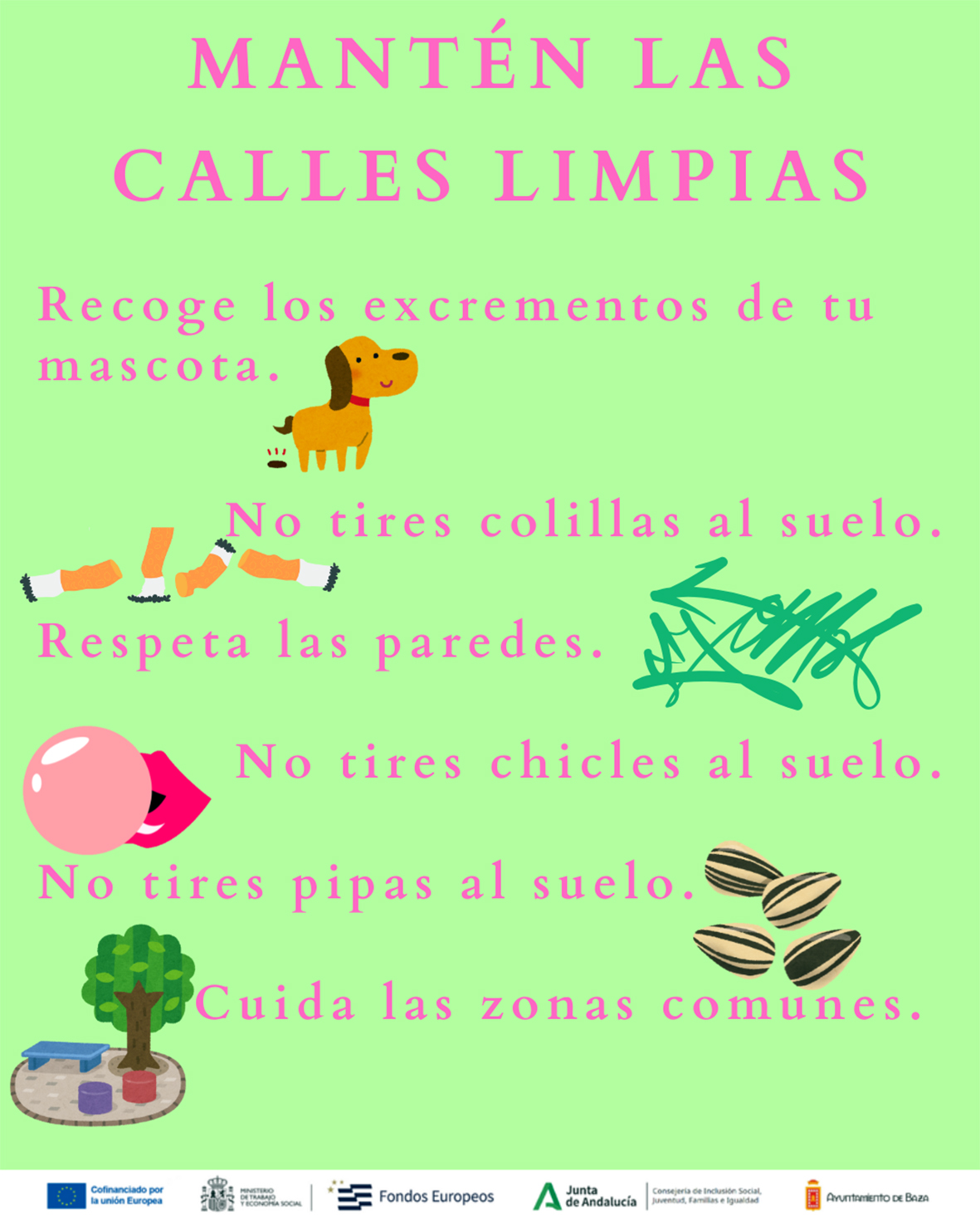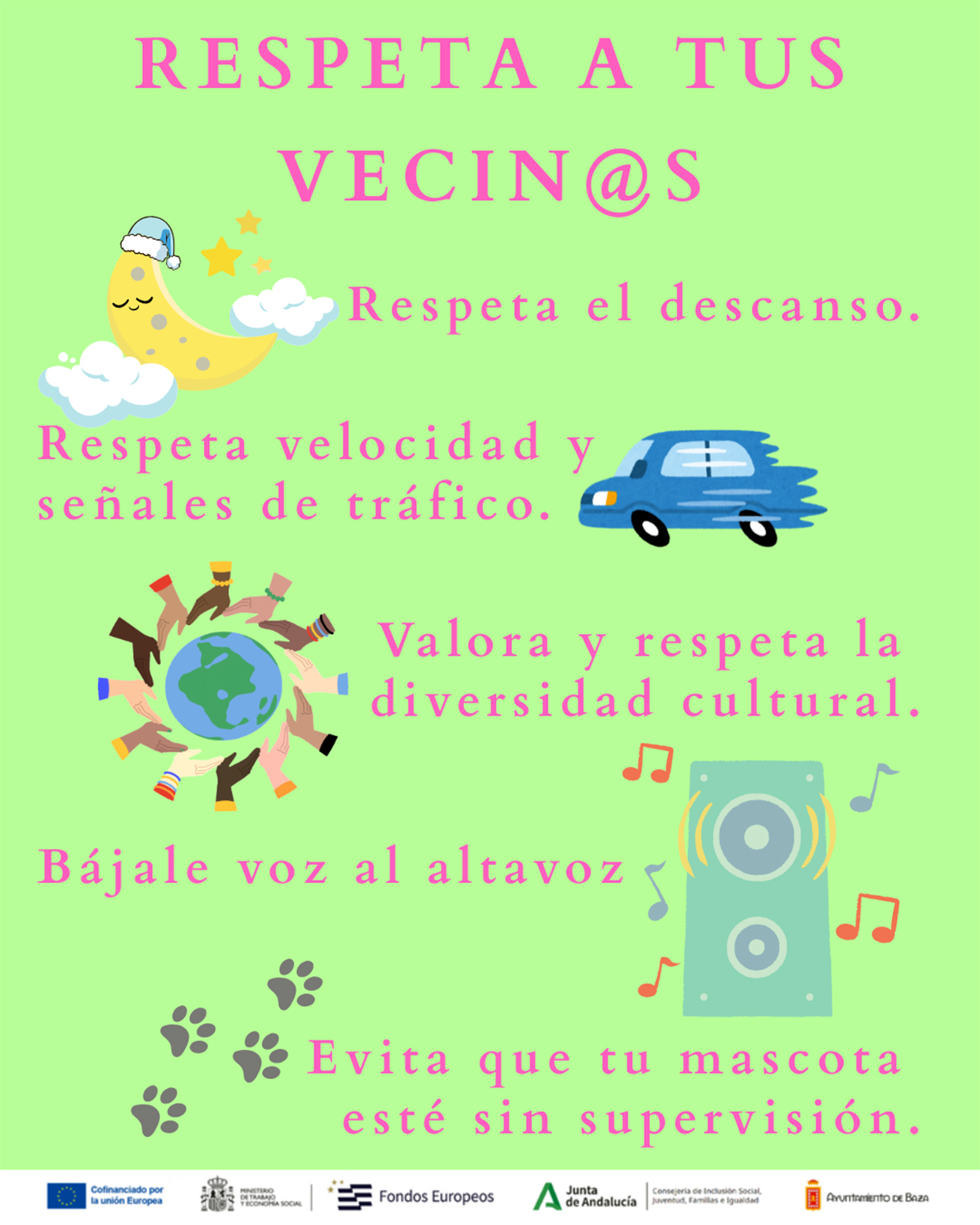 Desde este recurso, hemos creado una campaña de sensibilización con el lema “Cuidando nuestro barrio, nos cuidamos tod@s”, en la que se abordan aspectos tan importantes como reciclaje, mantenimiento y limpieza de espacios públicos, civismo y respeto a nuestros/as vecinos/as.