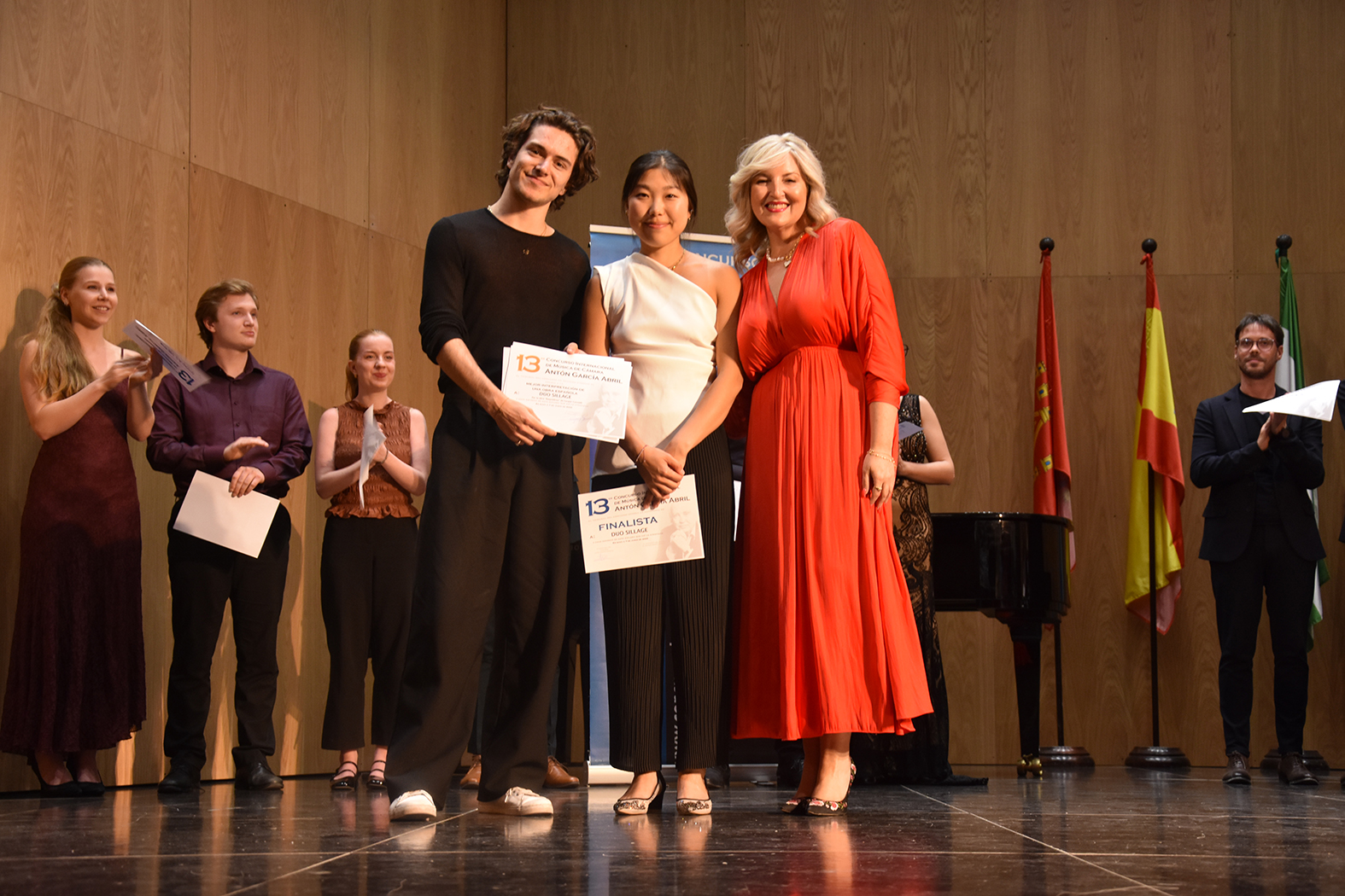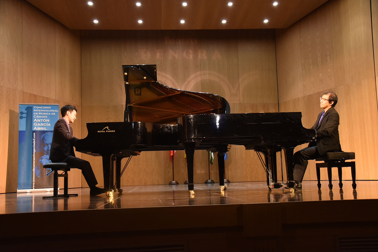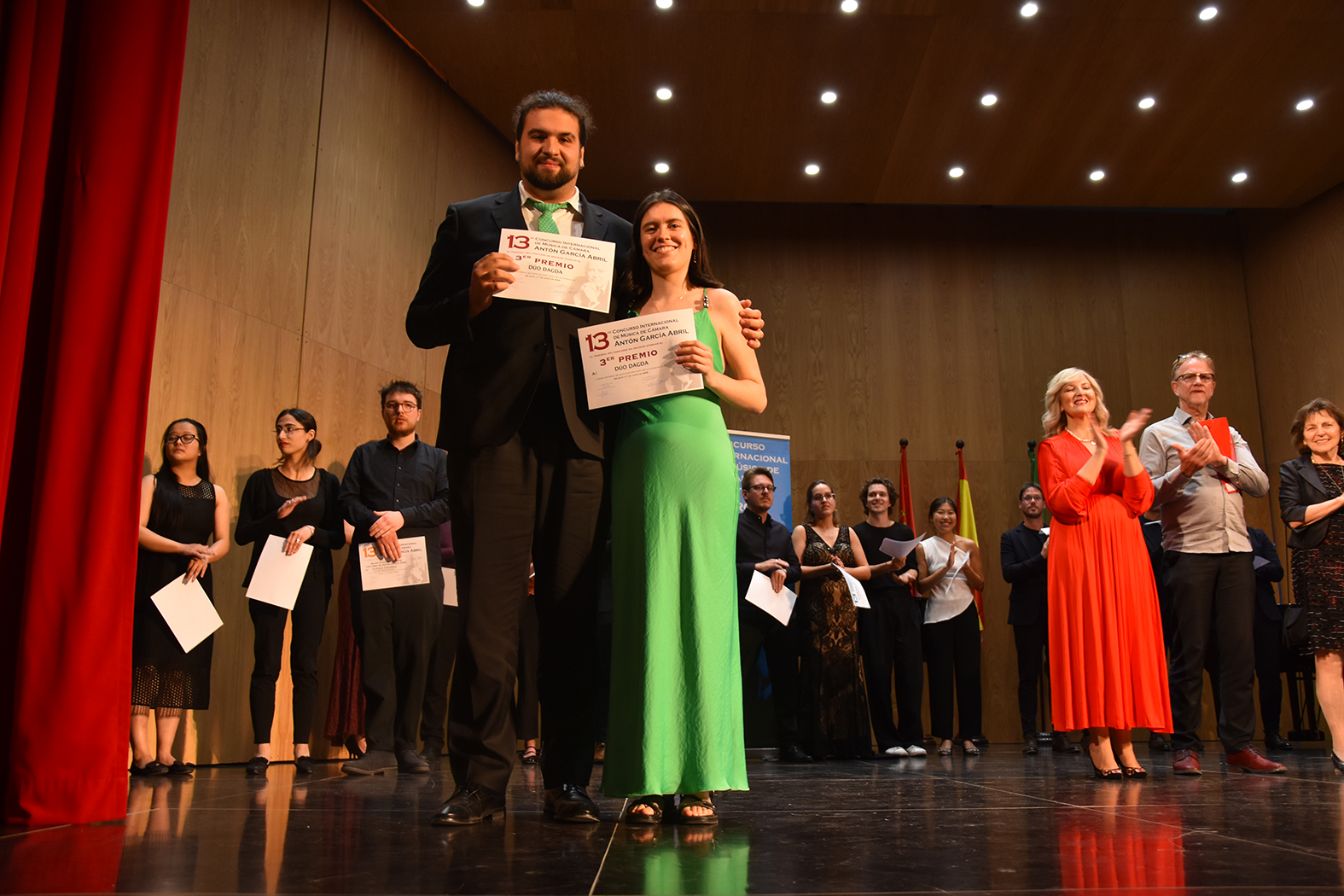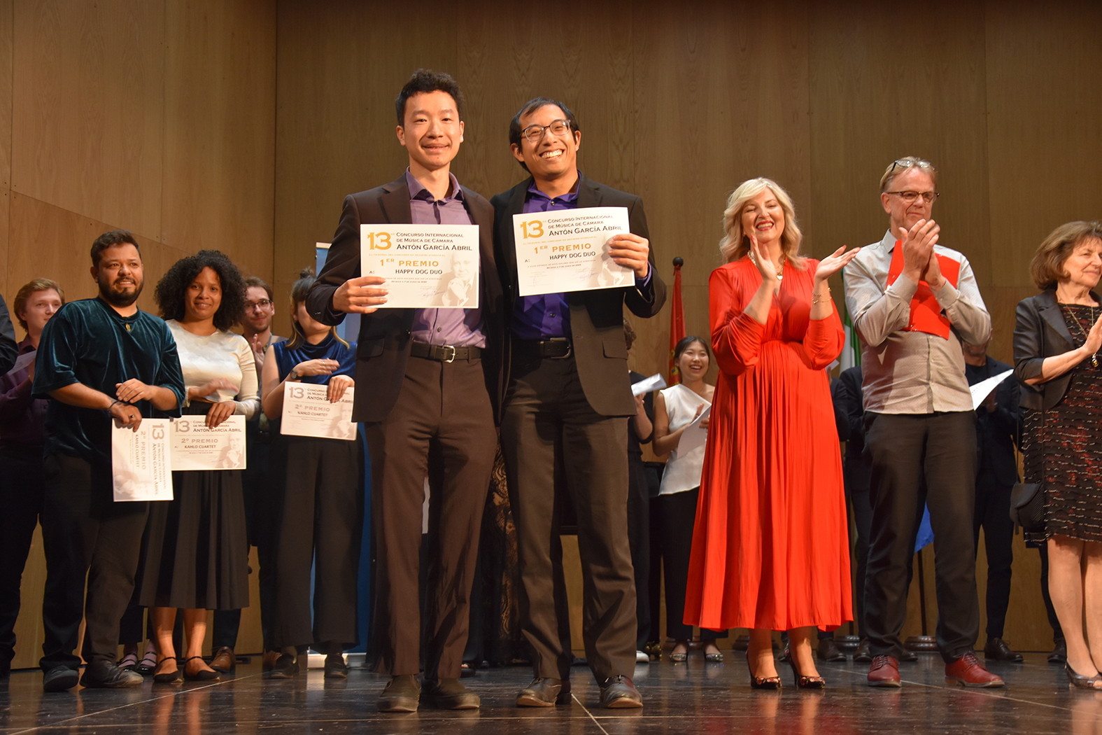 “Happy Dog Duo”, así se llama el dúo de piano que ha conseguido el primer premio en la decimotercera edición del Concurso Internacional de Música de Cámara “Antón García Abril” que se ha celebrado del 5 al 7 de junio en el teatro Dengra de nuestra ciudad. 30 grupos, con 92 participantes, han concurrido en el certamen, agrupaciones llegadas desde once países, incluido el nuestro: Portugal, Países Bajos, Finlandia, Italia, Alemania, Estados Unidos, Polonia, Bélgica, Austria y Suiza. Si a ellos sumamos los aspirantes que se han quedado fuera se concluye que estamos ante la edición más demandada de cuantas se han celebrado.