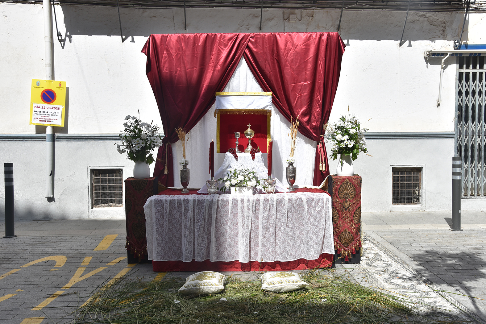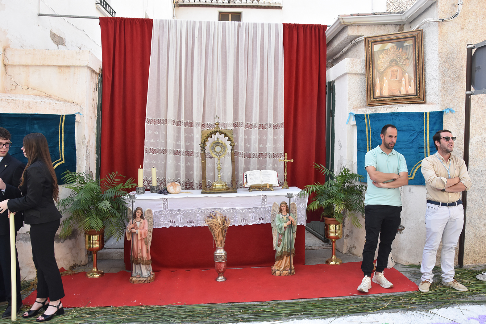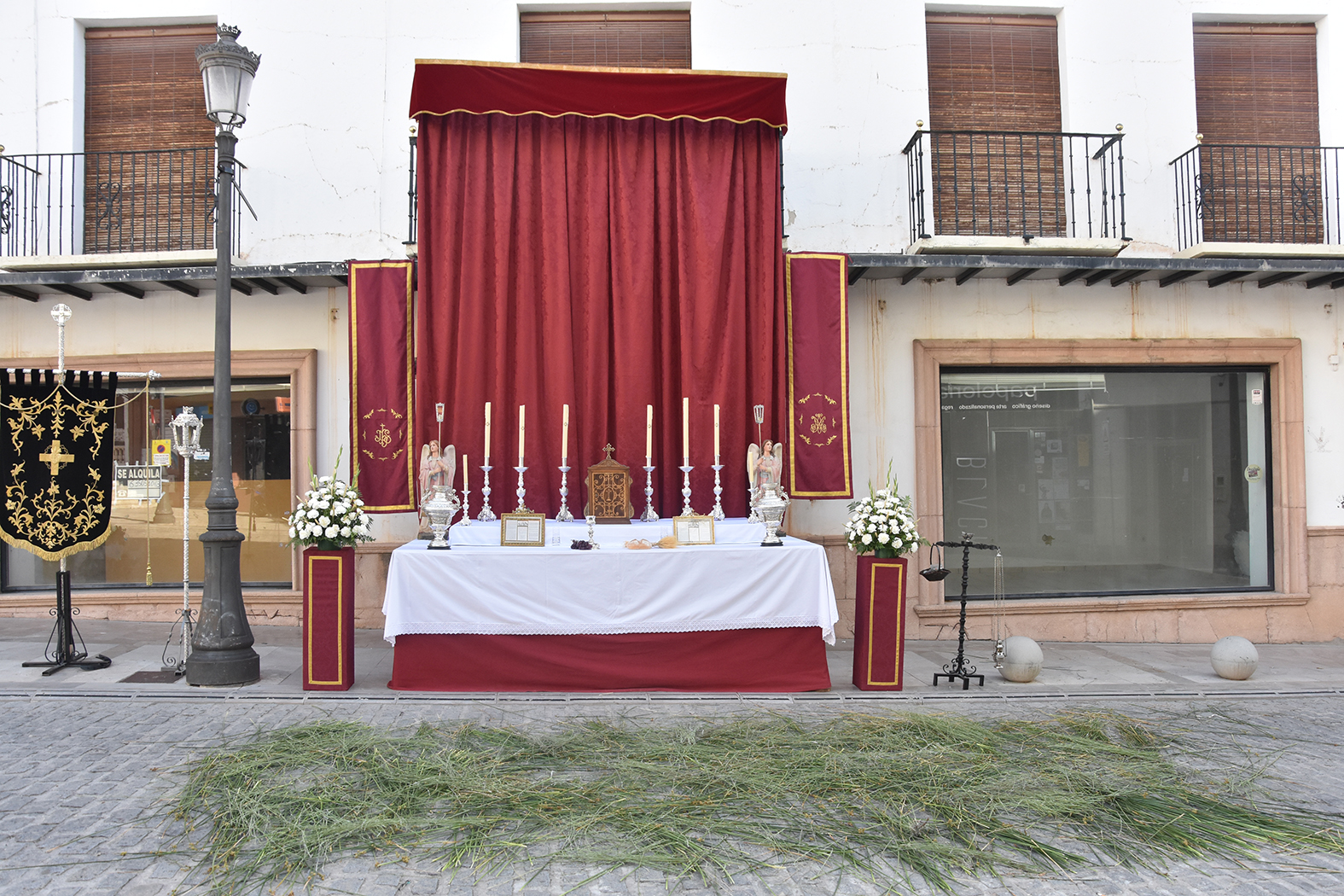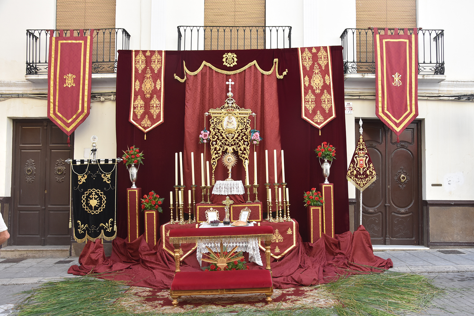 Como es habitual, la Custodia se ha ido deteniendo en cada uno de los altares para elevar algunos rezos y cantos. Así ha sucedido en los altares que han construido las cofradías de Los Méndez, Esperanza, Santiago, Santa Cruz, Nazareno, Cristo Yacente, Silencio y Soledad en los lugares ya habituales, a los que se ha unido de nuevo el altar de Cáritas en calle Agua.