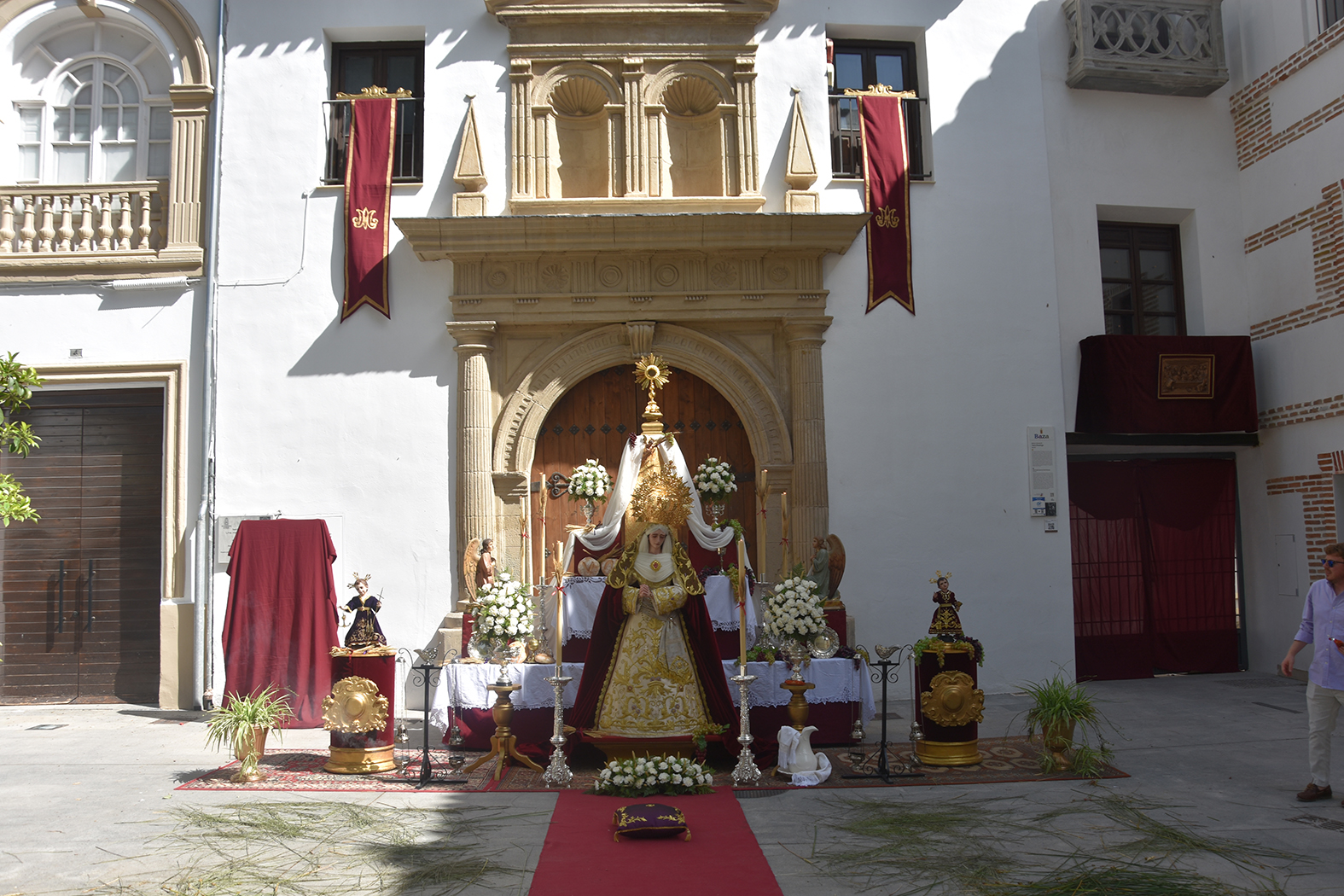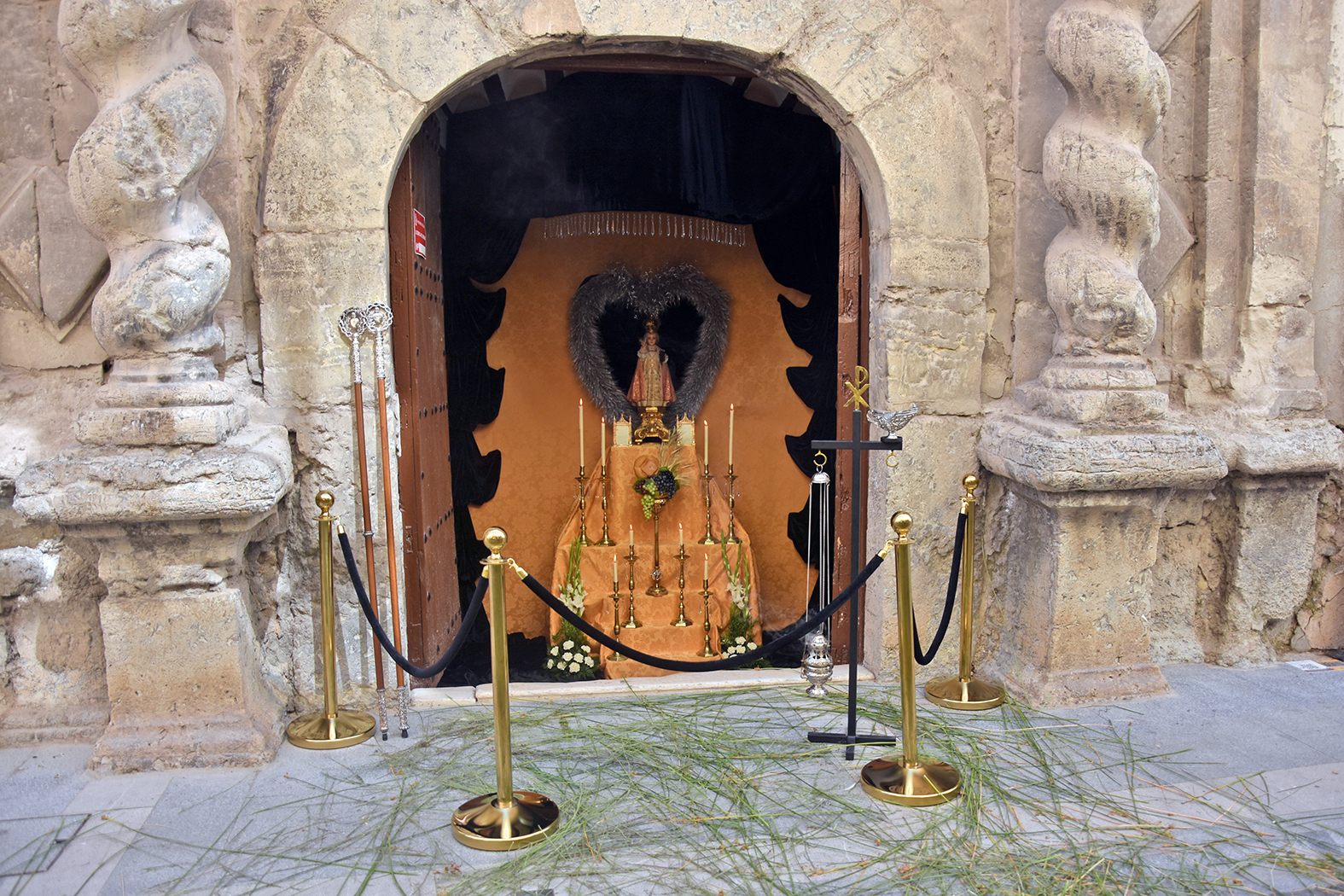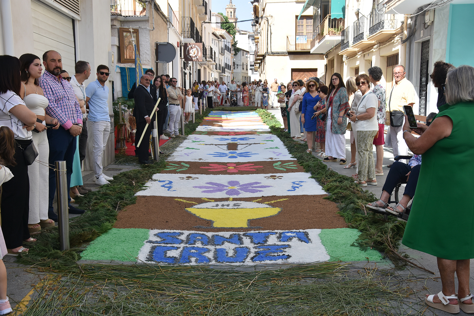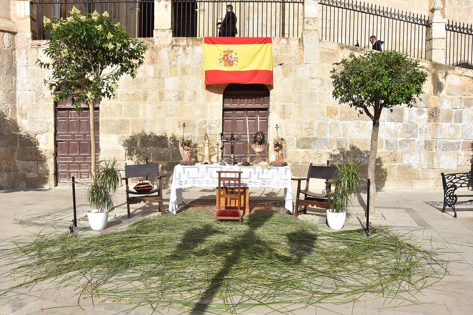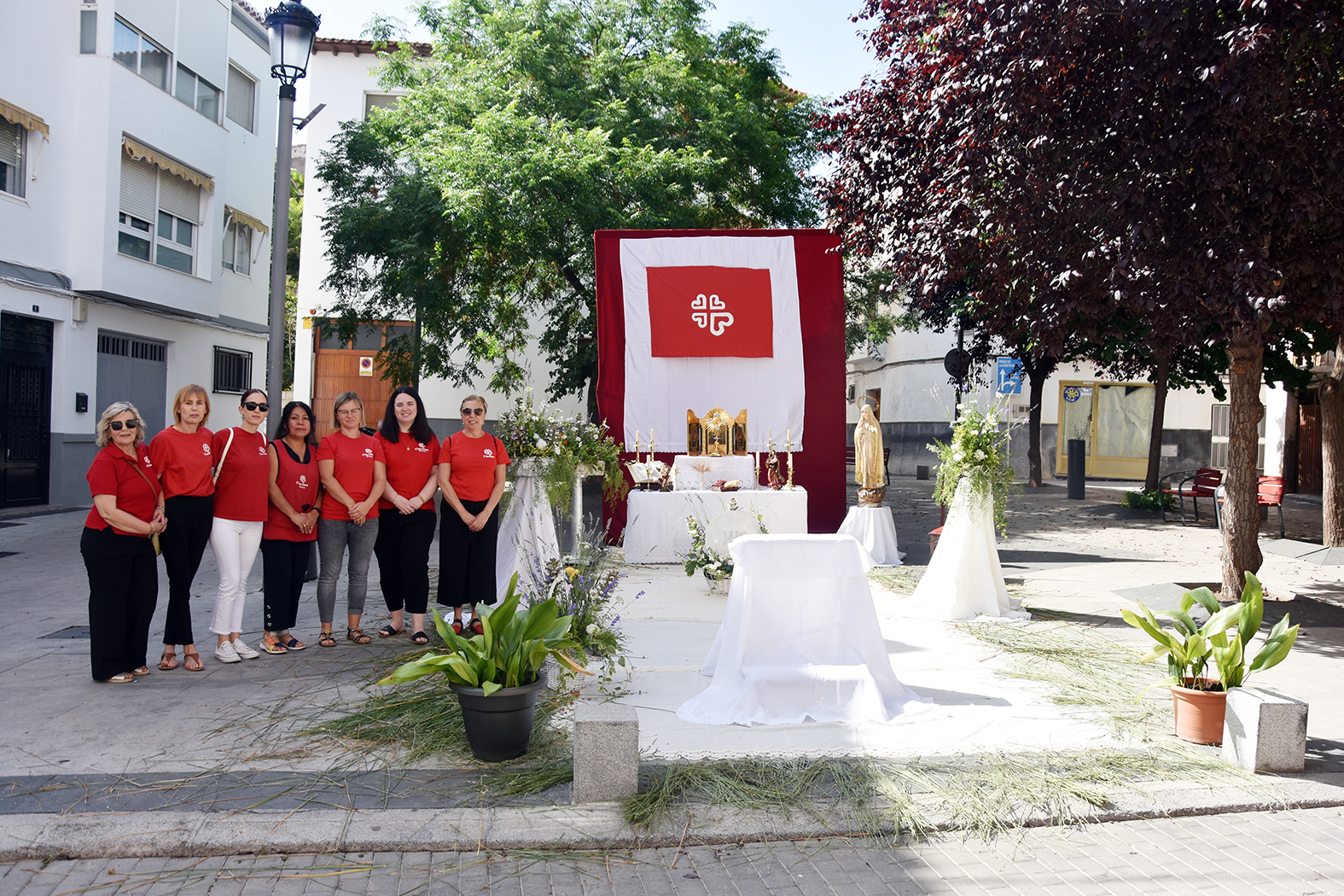 Como es habitual, la Custodia se ha ido deteniendo en cada uno de los altares para elevar algunos rezos y cantos. Así ha sucedido en los altares que han construido las cofradías de Los Méndez, Esperanza, Santiago, Santa Cruz, Nazareno, Cristo Yacente, Silencio y Soledad en los lugares ya habituales, a los que se ha unido de nuevo el altar de Cáritas en calle Agua.