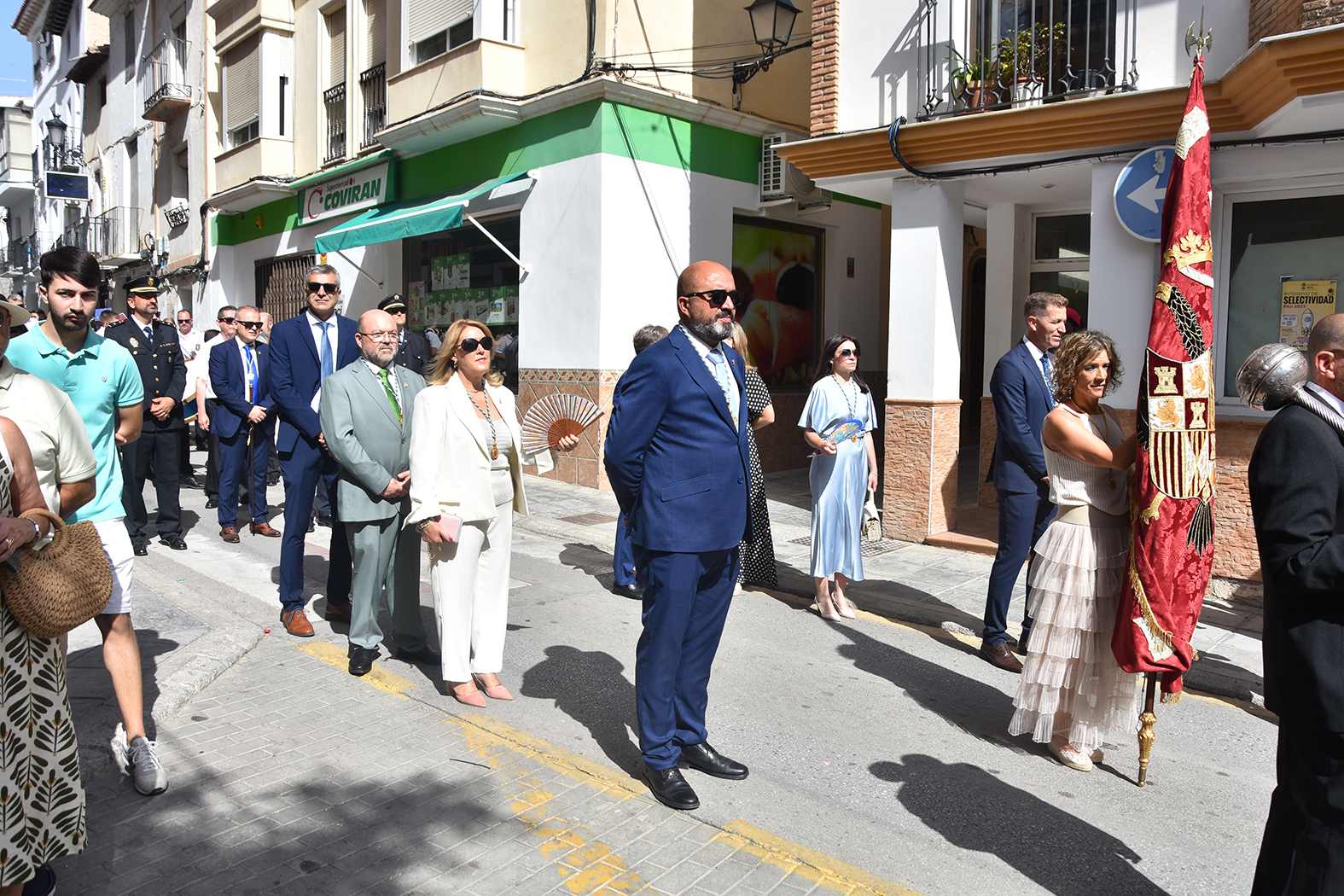 El alcalde, Pedro J. Ramos, bastón en mano, ha encabezado la corporación municipal, que una vez más ha procesionado el pendón real. Junto a él han estado también los representantes de la Policía Nacional, Policía Local y cuerpo de Bomberos.