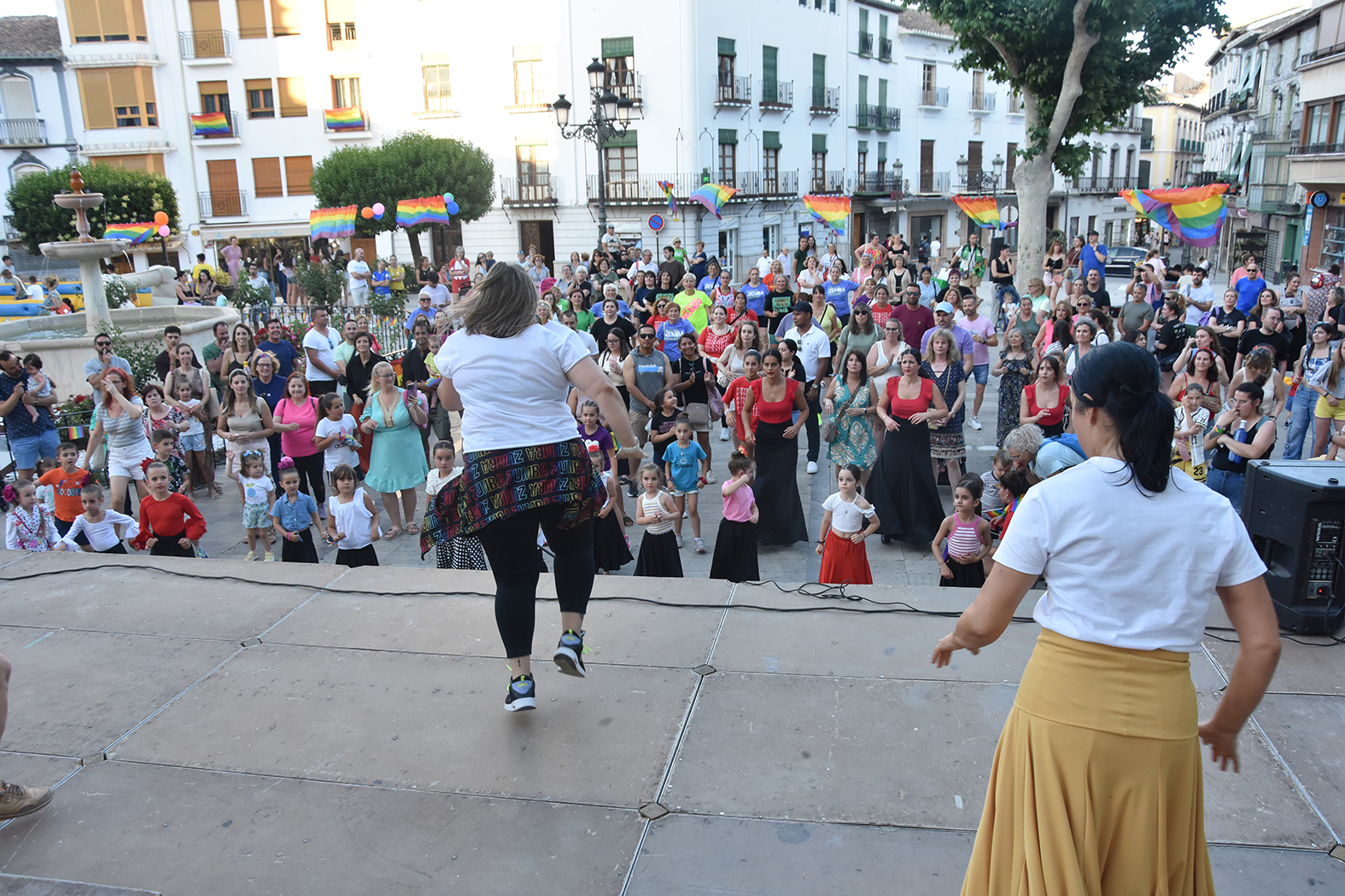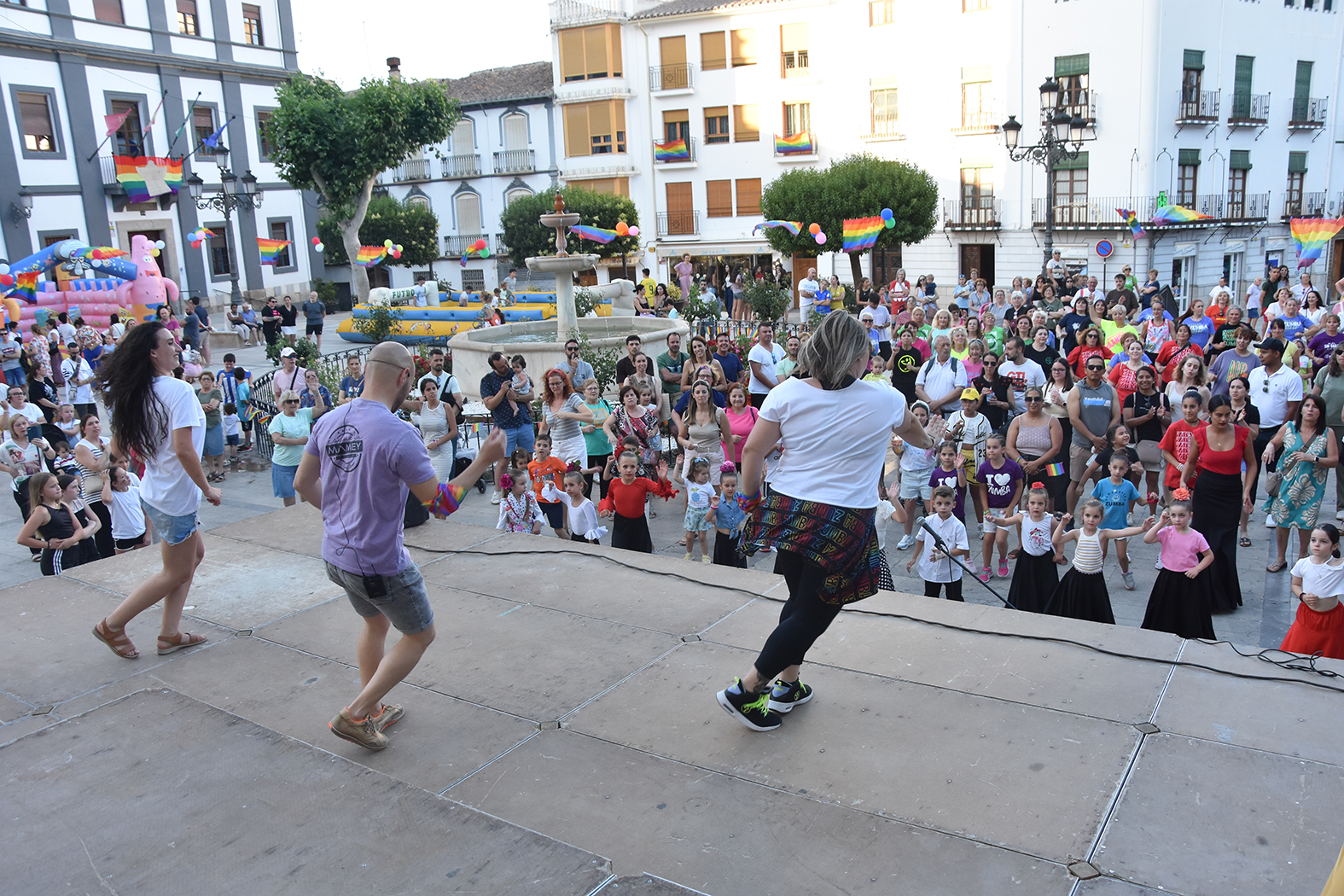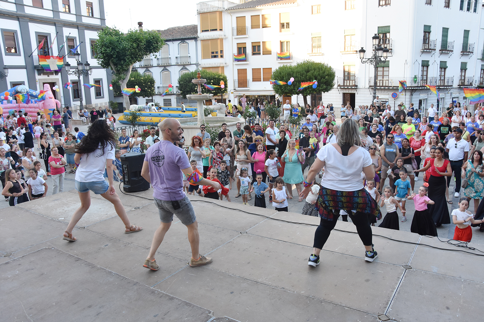 El baile, en distintas modalidades pero compartido y al compás, fue el protagonista de la fiesta del Baza Pride 2025 que se celebró en la tarde del pasado 25 de junio. Una convocatoria por la igualdad y el respeto entre la diversidad sexual, que reunió a varias decenas de personas, de diferentes edades, en la Plaza Mayor, y que se sucedió con muy buen ambiente y en la mejor sintonía. Las concejalías de Bienestar Social y Juventud habían preparado un escenario con talleres relacionados con el objetivo de esta fiesta, con los hinchables para los más pequeños y con una actividad muy divertida alrededor de bailes de distinta índole pero que todos se bailaron al unísono.