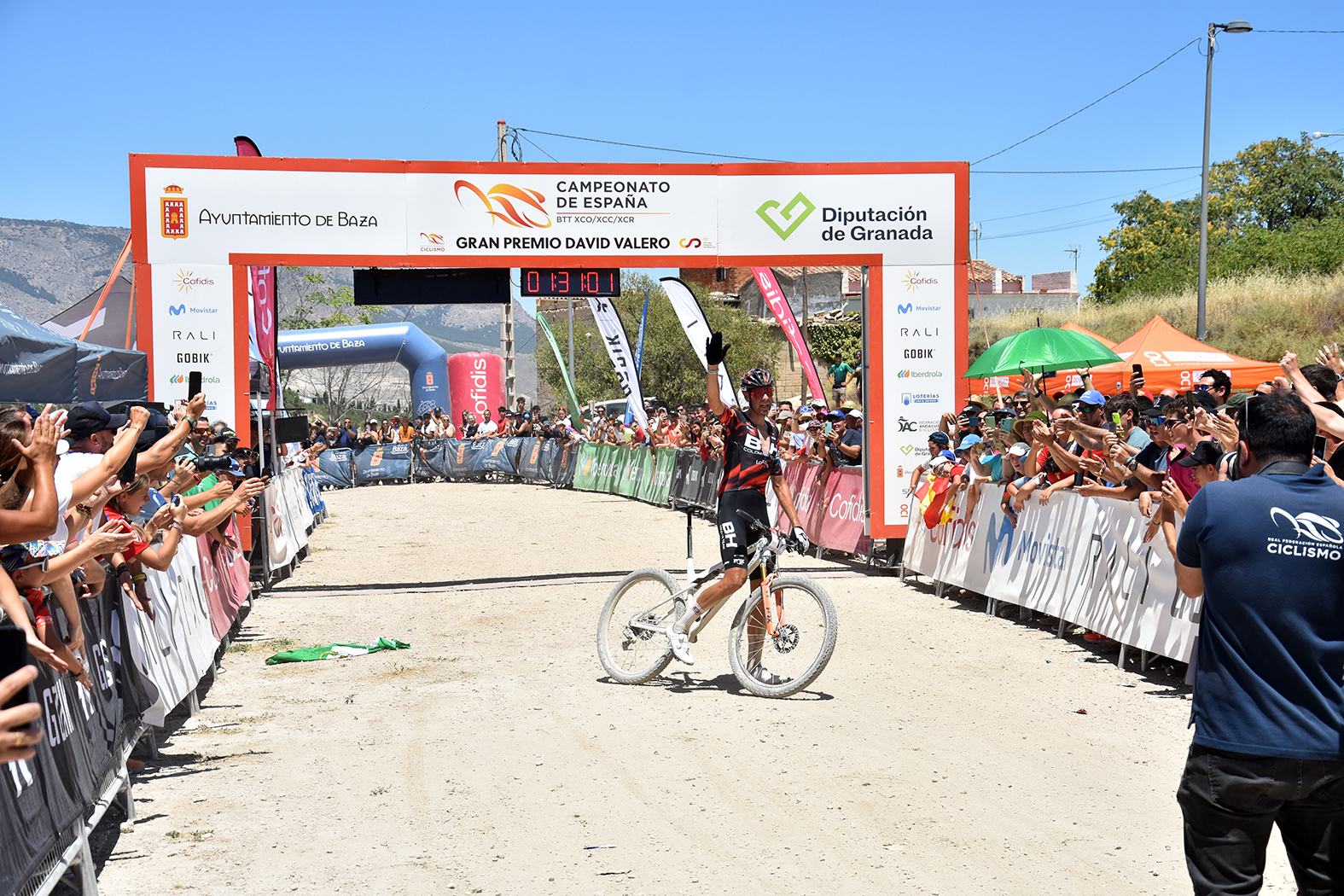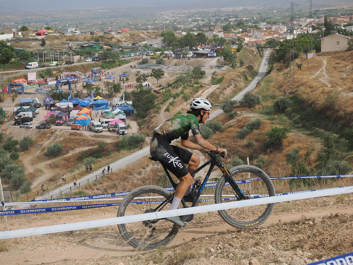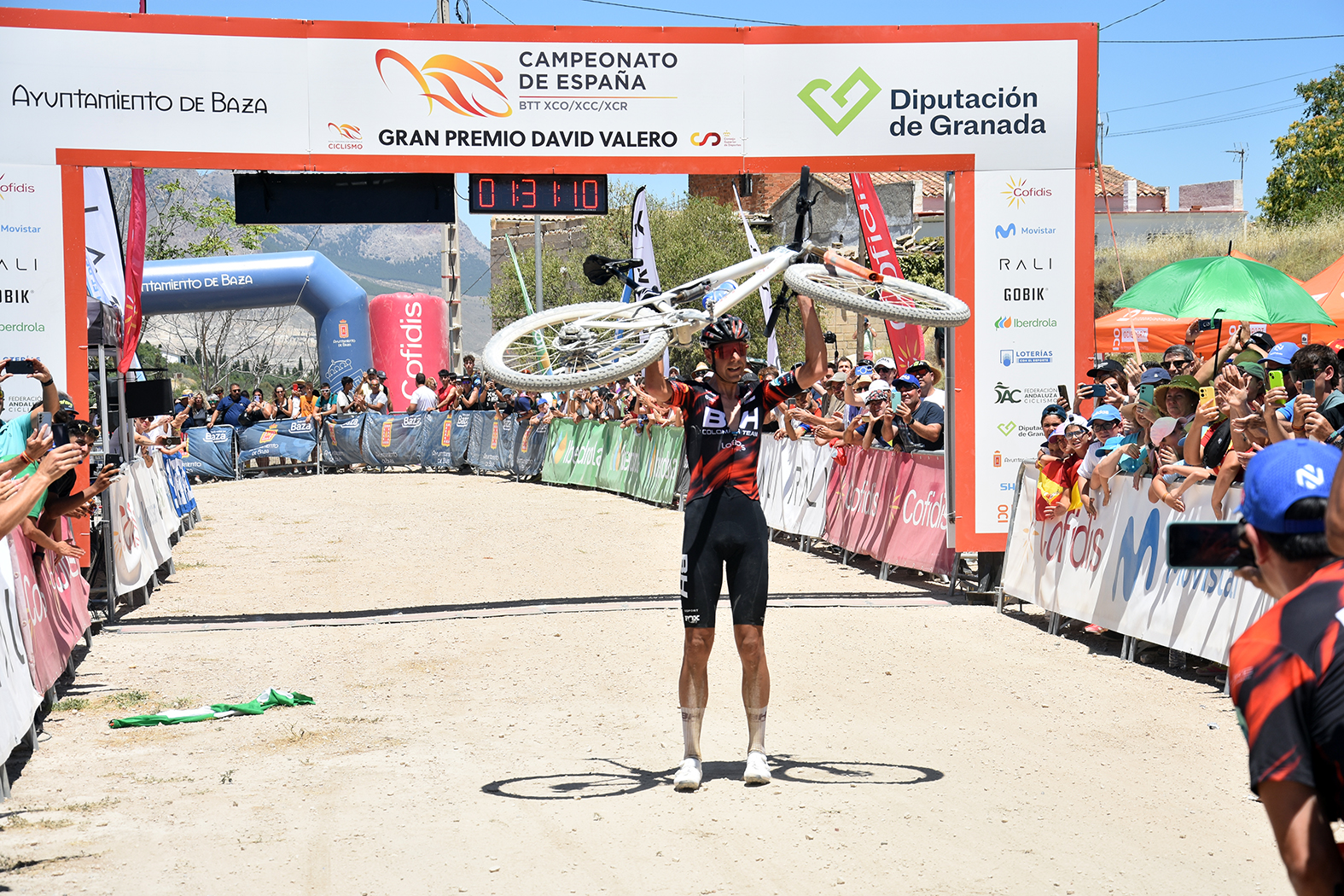 El circuito de bicicleta de montaña “David Valero” de Baza ha acogido, del 18 al 20 de julio, el Campeonato de España de BTT en las modalidades XCO, XCC y XCR. Remodelado en algunos de sus tramos para esta cita, este recinto ha sido el escenario ideal para la nueva gesta del deportista bastetano más importante de la historia, cuya trayectoria no deja de mejorar. Ante su gente, su familia, sus vecinos y sus paisanos, que no han dejado de animarlo y jalearlo durante toda la carrera, David Valero, del BH Coloma Team, se ha proclamado por décima vez Campeón de España de XCO en la categoría Élite, algo que nadie ha conseguido hasta el momento y que el ciclista olímpico de Baza ha acogido con la humildad y sencillez que lo caracteriza. La prueba, con la que se cerraba la programación de este campeonato, ha sido un paseo triunfal para Valero, que no ha dejado la primera posición en las siete vueltas al circuito que han tenido que sufrir los participantes. El alcalde de Baza, Pedro J. Ramos, ha sido el encargado de imponerle la medalla de oro en el podium, entre los aplausos y las emocionadas felicitaciones del público asistente. “Aunque era algo previsible, la victoria de David ha terminado siendo más que evidente, lo que no deja dudas de su posición en la BTT nacional. Estamos muy contentos por este nuevo éxito y le mandamos nuestra más sincera felicitación en nombre de toda la ciudad”, ha indicado Ramos tras la entrega de los premios.