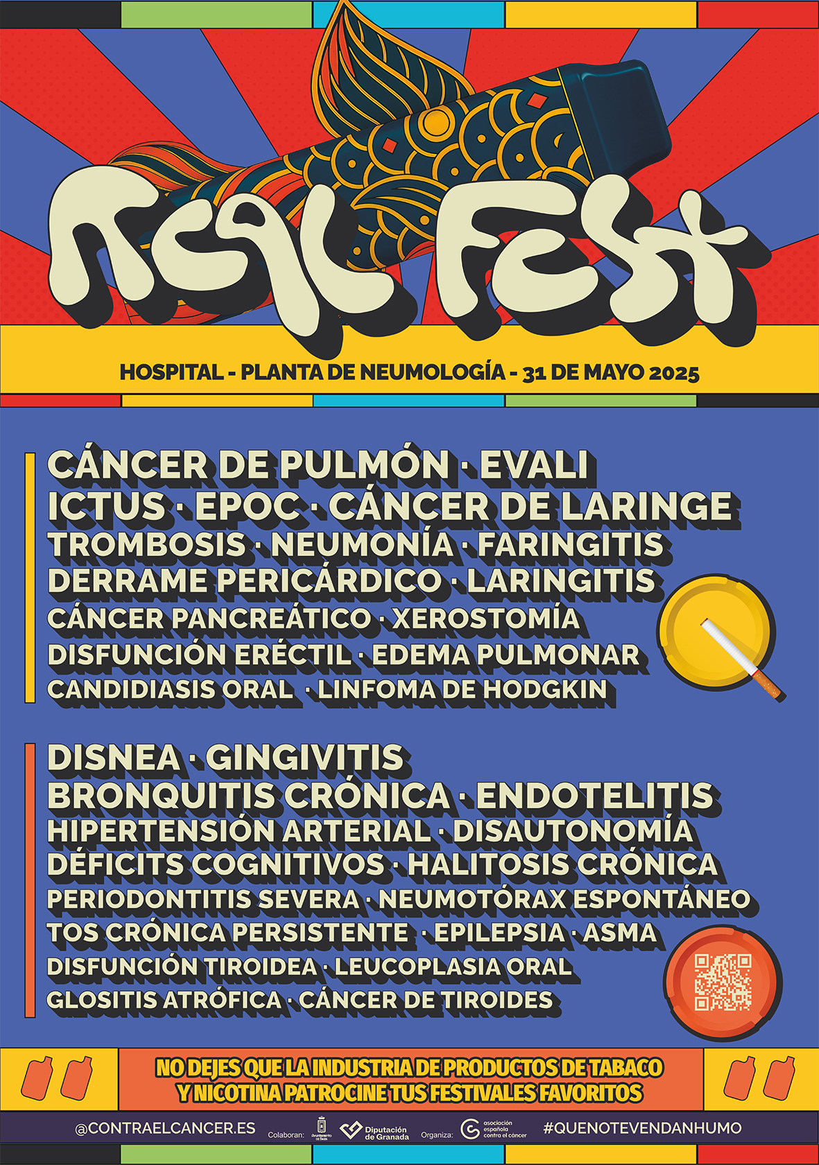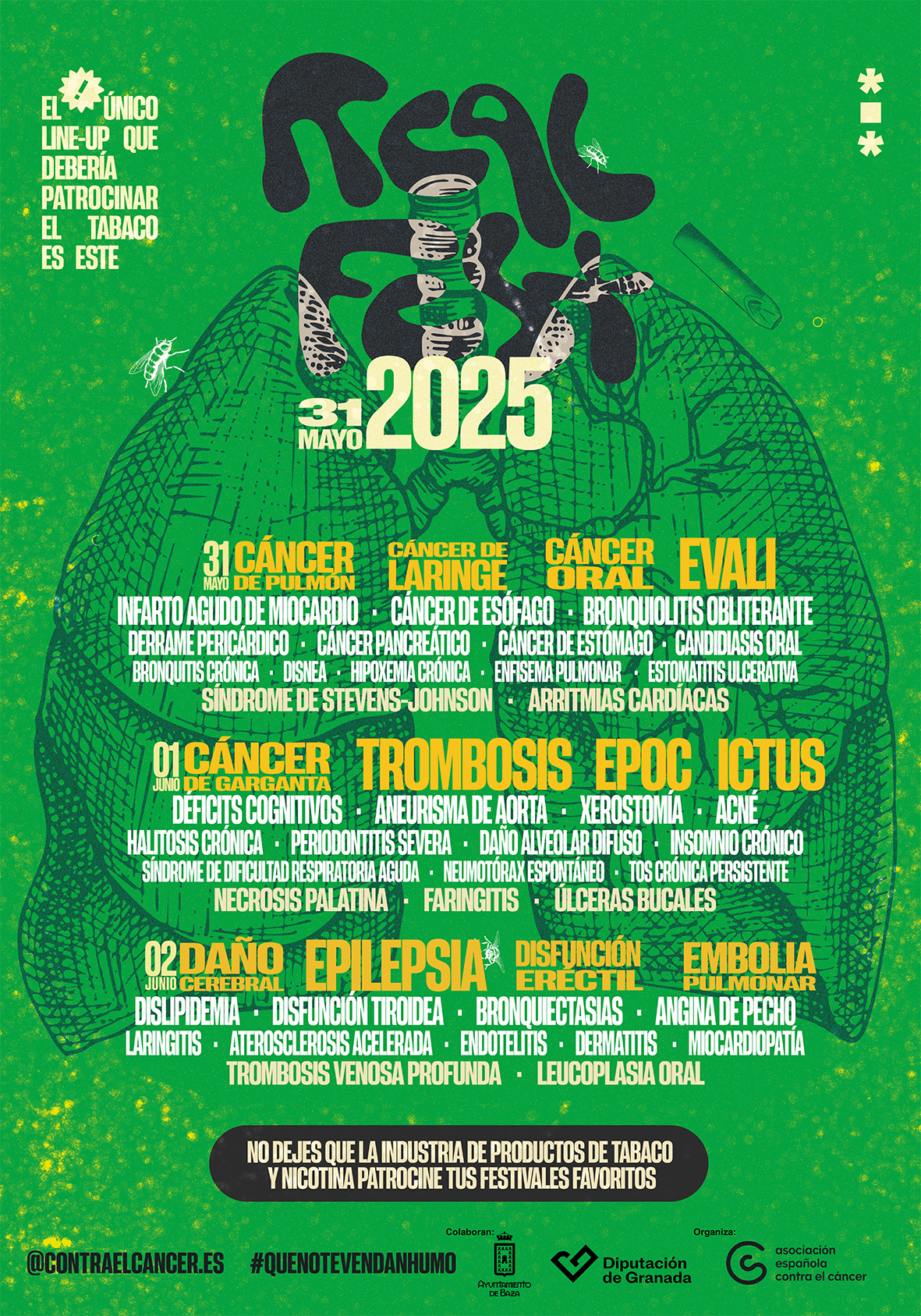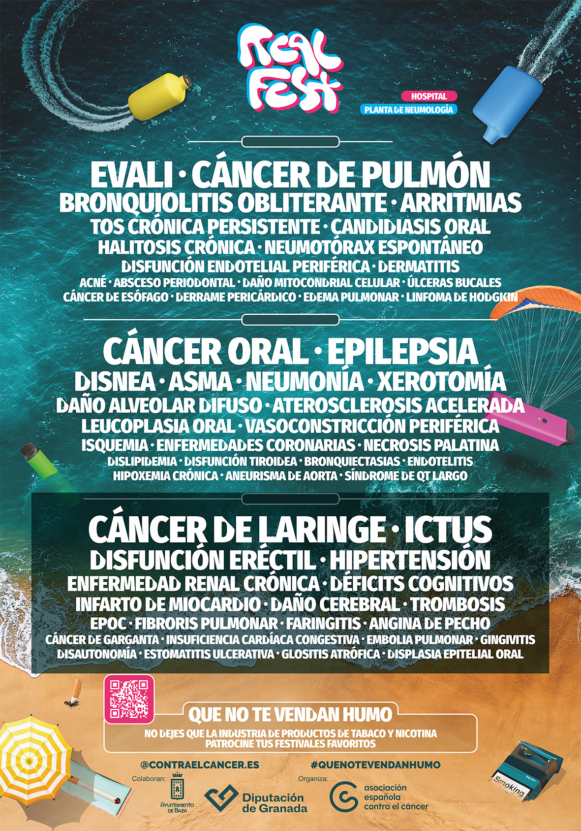 Ante estos datos tan preocupantes, la delegación de Juventud de la Diputación de Granada y la Asociación Española Contra el Cáncer, en colaboración con el Ayuntamiento de Baza en nuestra ciudad, han puesto en marcha la campaña de sensibilización “Real Fest” dentro de las acciones enmarcadas en la estrategia “2030, primera generación de jóvenes libre de tabaco”, perteneciente al programa de prevención del consumo de tabaco y vapers. Para ello han diseñado varios carteles bajo la apariencia de carteles de conciertos y festivales de música, en donde se advierten las múltiples consecuencias que el vapeo puede conllevar. Esta cartelería se va a distribuir entre la juventud con el objetivo de promover conductas saludables alejadas de estos productos.