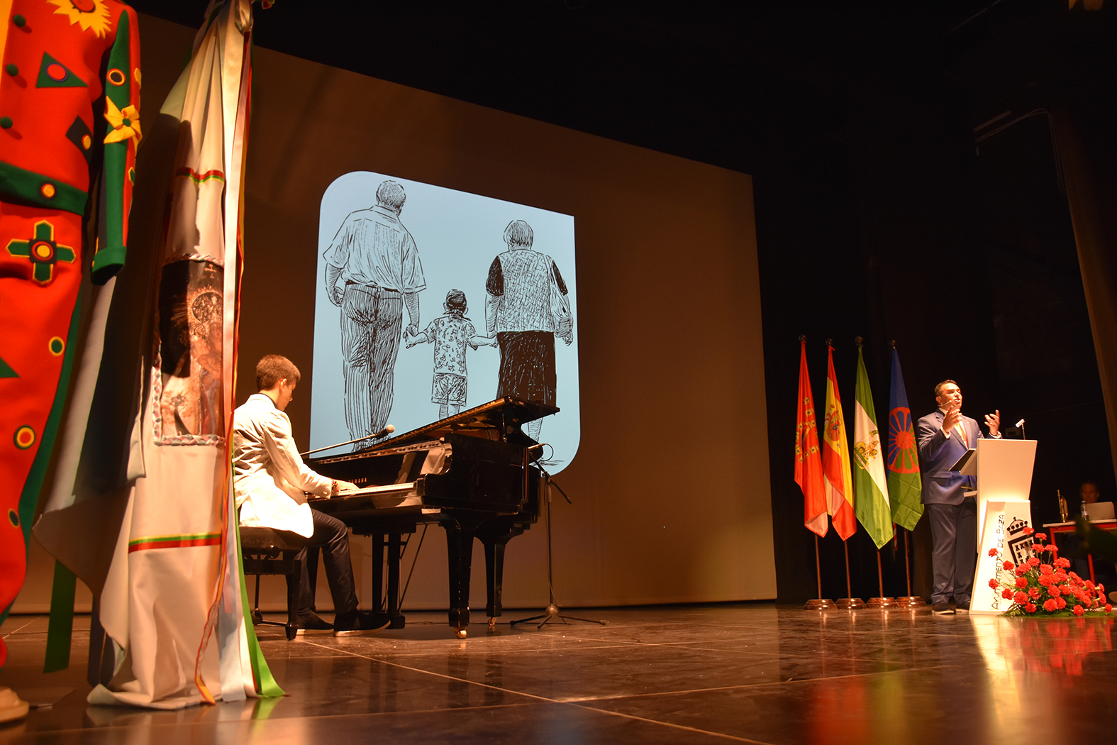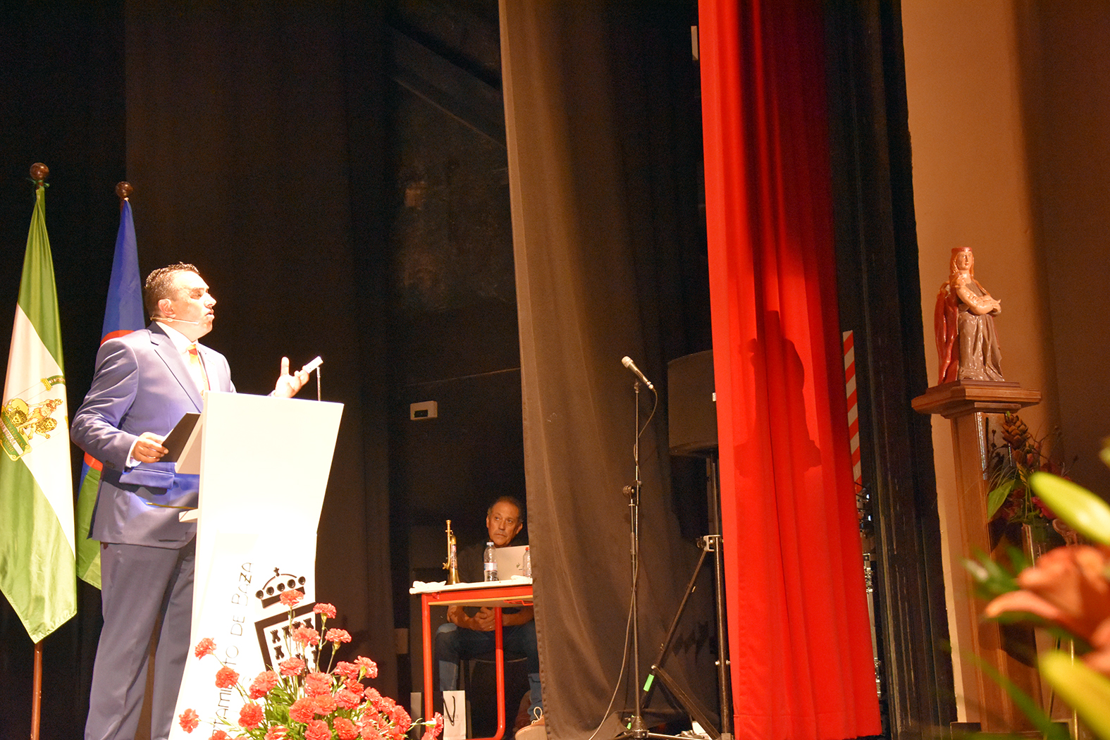 Calentita de emociones la velada tras la entrega del Premio Cascamorras que acababa de producirse, el concejal de Cultura, José Gabriel López, fue el encargado de presentar al pregonero oficial de la Feria de Baza 2025. Ramón Rodríguez, que esperaba su turno en primera fila, subió dispuesto a contarle al mundo entero su amor a Baza, a su familia y a sus raíces. Para hacerlo aún más bello y más sentido, se rodeó de un grupo de artistas que le acompañaron al piano, a la corneta y al tambor, junto con otros que suministraron los fondos musicales en las distintas estampas que conformaron su discurso.