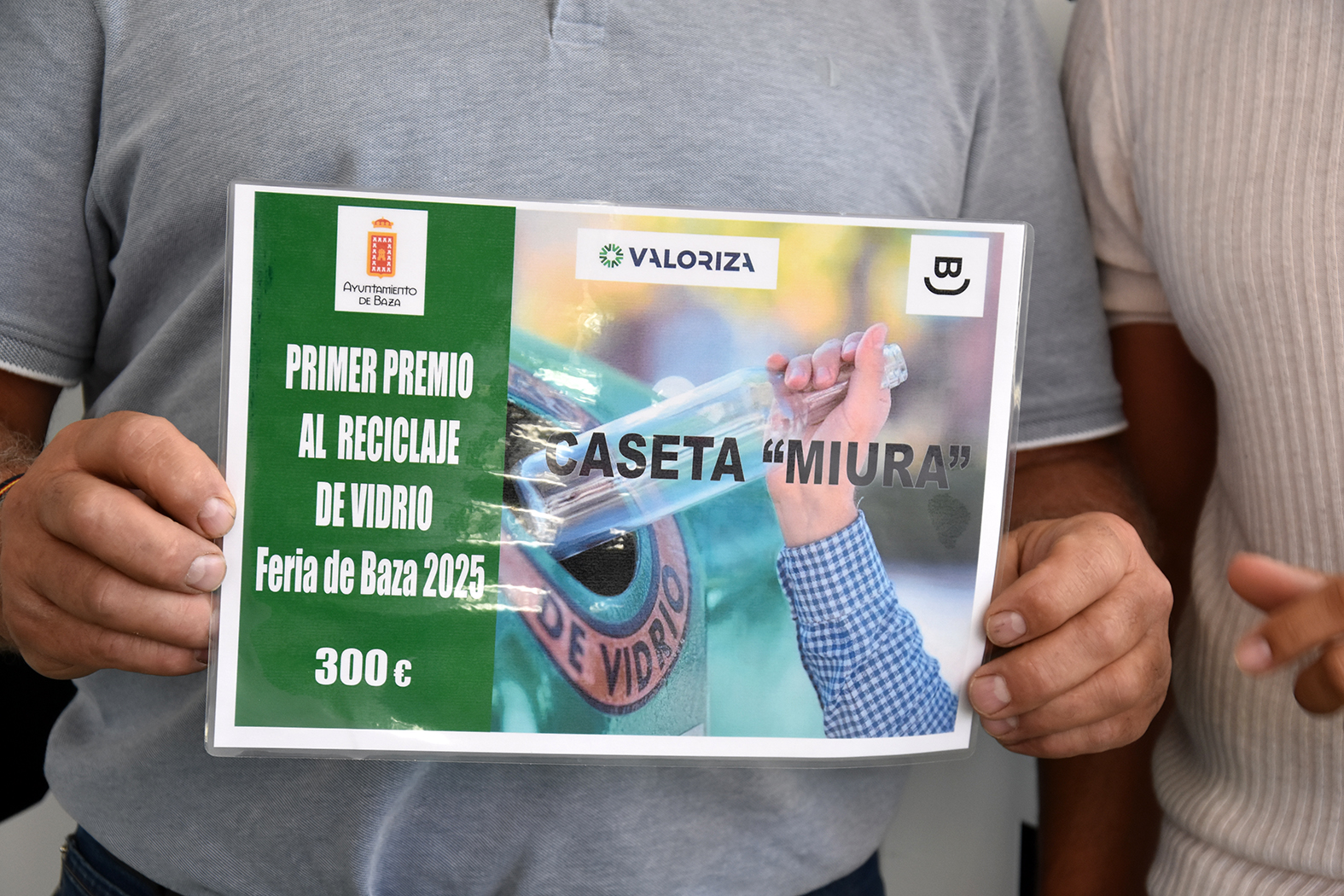 Para agradecer esta colaboración voluntaria de las casetas, el concejal de Mantenimiento del Ayuntamiento, Rafael Azor, acompañado por el presidente de Emuviba, José Antonio Valdivieso, y por el responsable de Valoriza en la ciudad, Sergio Yeste, han entregado un diploma acreditativo del primer Premio al reciclaje de vidrio Feria de Baza 2025, reconocido con 300 euros, a uno de los propietarios de la caseta “Miura”.
